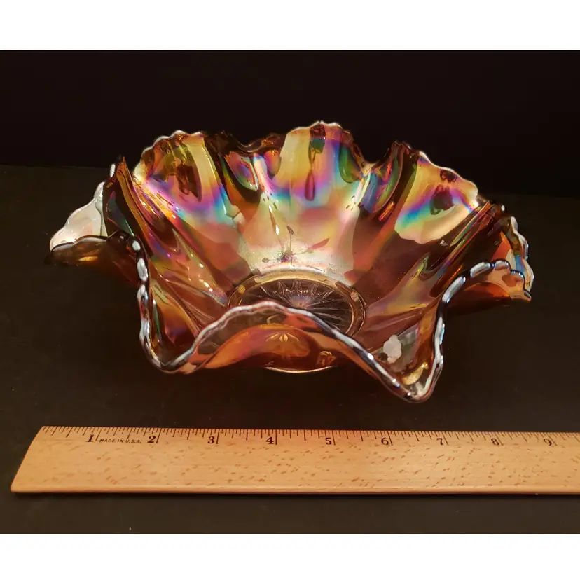 Marigold Carnival Glass Bowl Imperial “Plain Jane” Ruffled Edges Star Base 9” Vintage