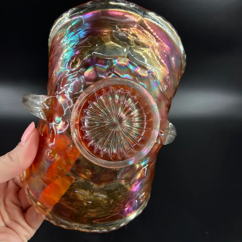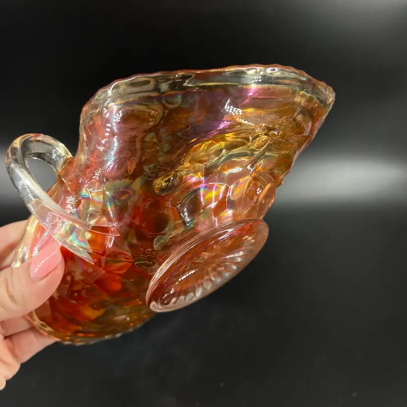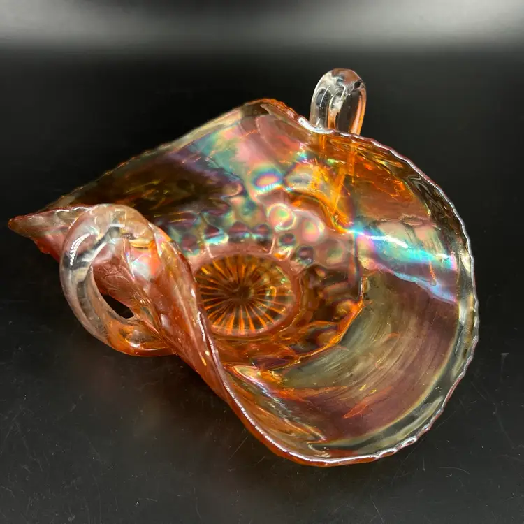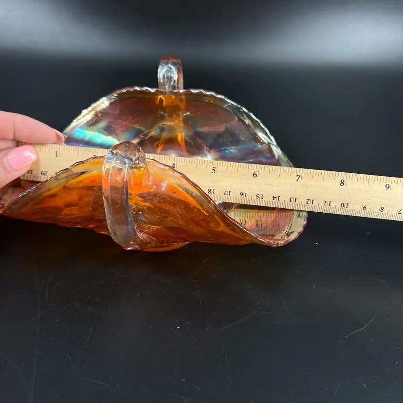 This marigold dish has double handles. It has an iridescent finish. It measures approx 7” wide.