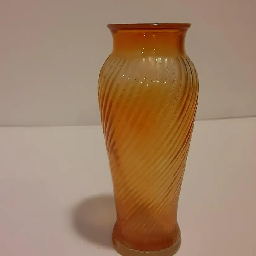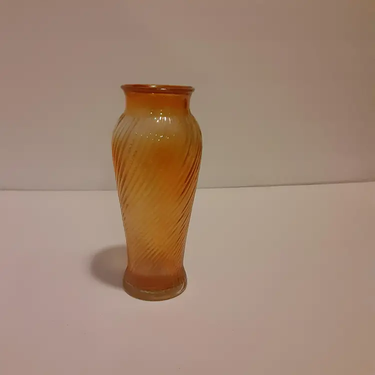This vintage glass vase is a beautiful addition to any collection. Made by Imperial Glass, it features a stunning swirl pattern and a marigold carnival glass color. The vase is made of high-quality glass and crafted using a carnival glass production style. Perfect for displaying as a decorative piece or for use as a vase, this item is sure to catch the eye of any guest. The vase is almost 8 inches tall and 3 1/2 inches round.
