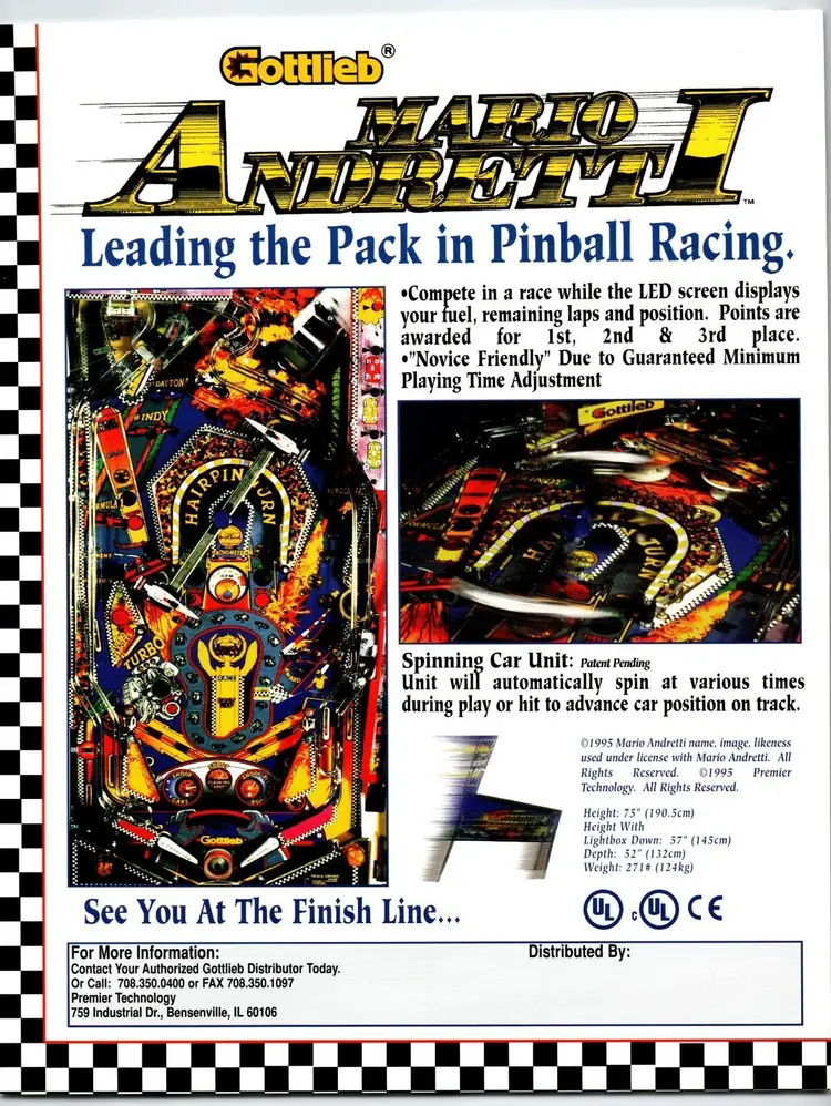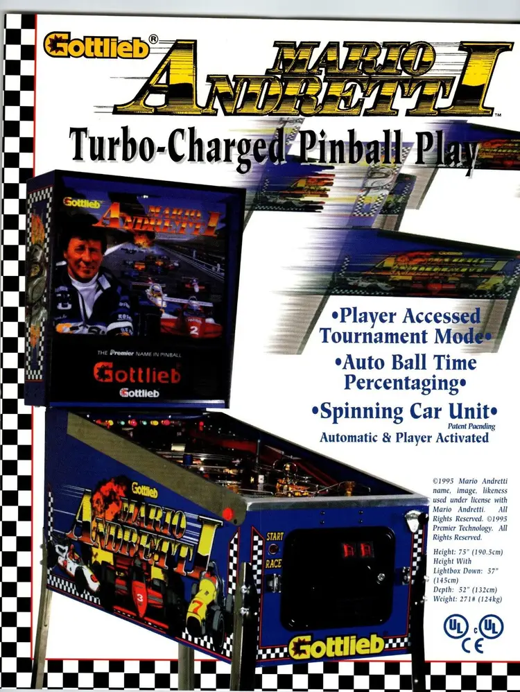 Brand: Gottlieb Year: 1995 Model: Mario Andretti Country/Region of Manufacture: United States Original: Paper Sales Flyer Modified Item: No Subject: Auto Racing Pinball: Flyer