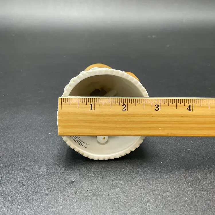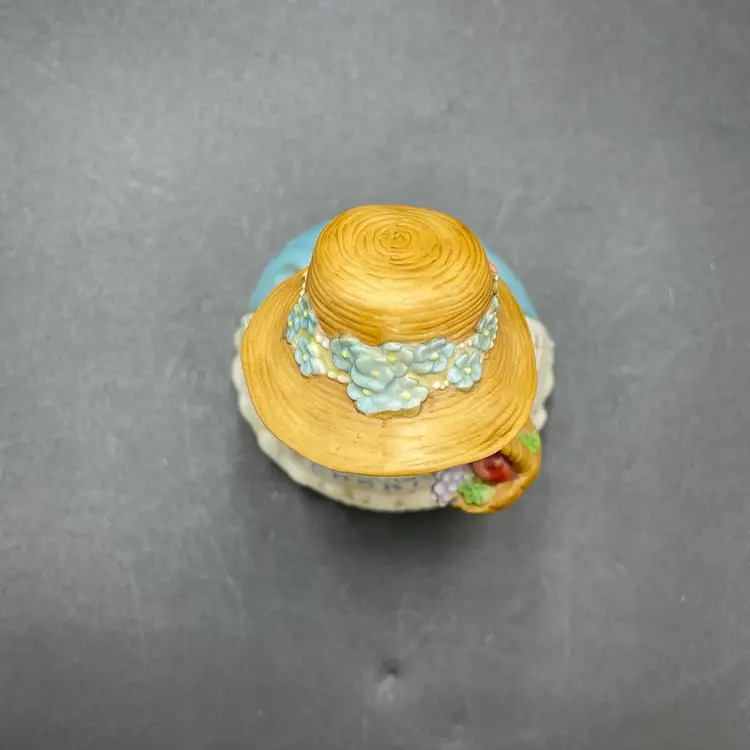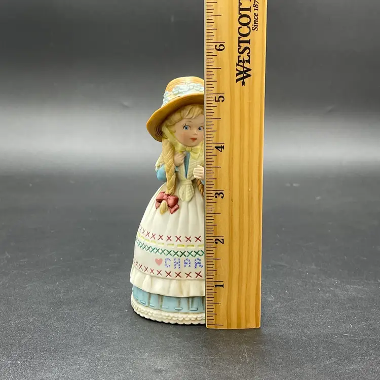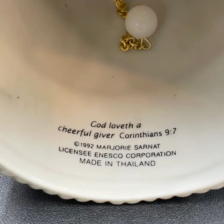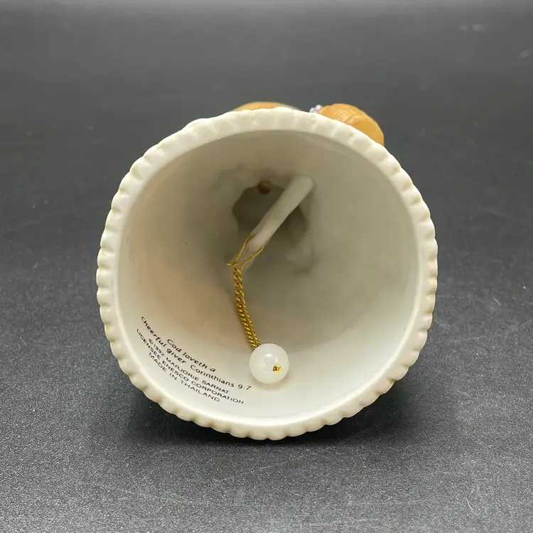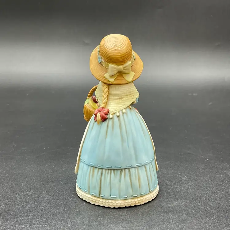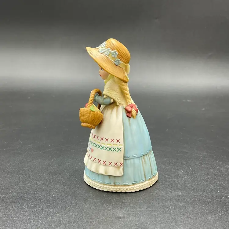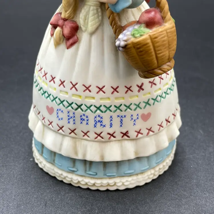 This is a vintage 1992 Marjorie Sarnat Charity girl with fruit basket porcelain figural bell. Marked on the inside. Measures approximately 5.25" tall x 2.5" across the bottom. No chips or cracks.