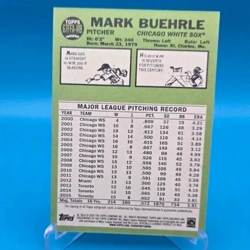 Mark Buehrle 2025 Topps Archives Fan Favorites autographed card retro 1967 style. NM or better condition. Shipped PWE.