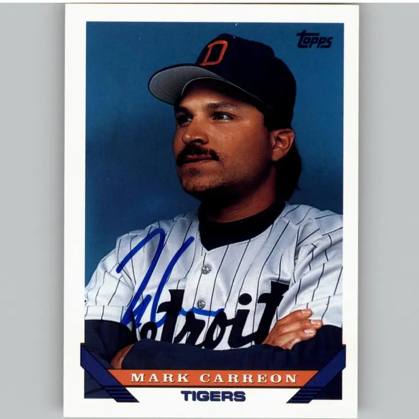 Collectible Topps baseball card featuring Mark Carreon of the Detroit Tigers, graced with his own signature. A prized addition for Tigers fans and autograph enthusiasts. Your purchase aids Signatures For Soldiers in their mission to support homeless and disabled veterans.