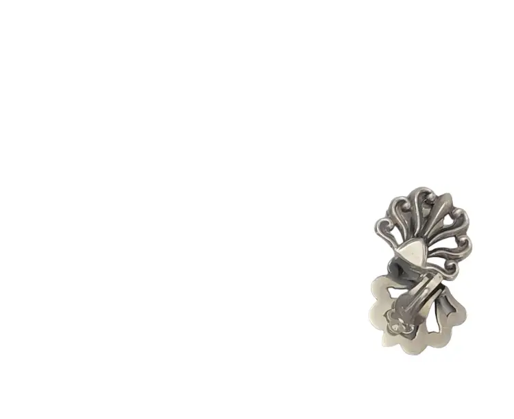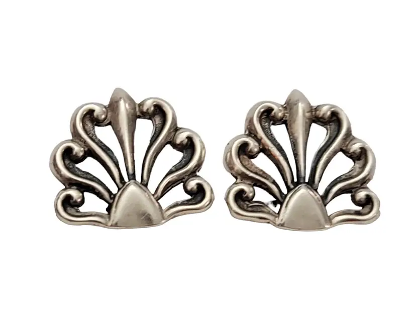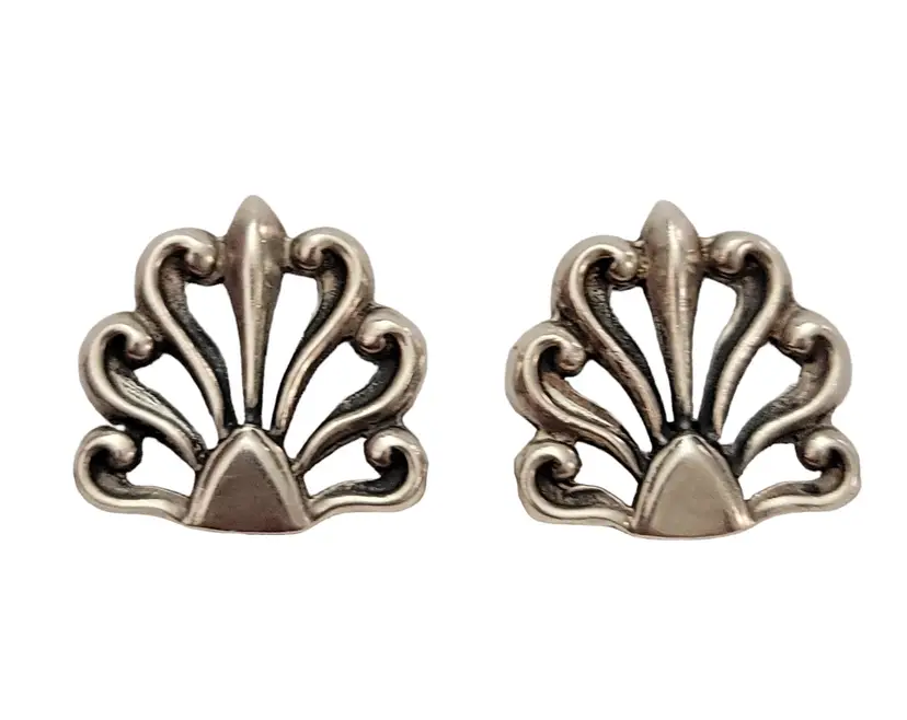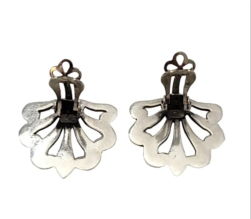 These are chic and substantial pair of vintage Mexican sterling silver clip-on earrings. Created from sterling silver with a beautiful fan style in an open-work design. Both earrings are marked MEXICO 925 NGA at the back indicating its metal purity. Each earring has a clip-on closure, a practical and convenient way to wear your favorite pair of earrings. A wonderful addition to your vintage jewelry collection!