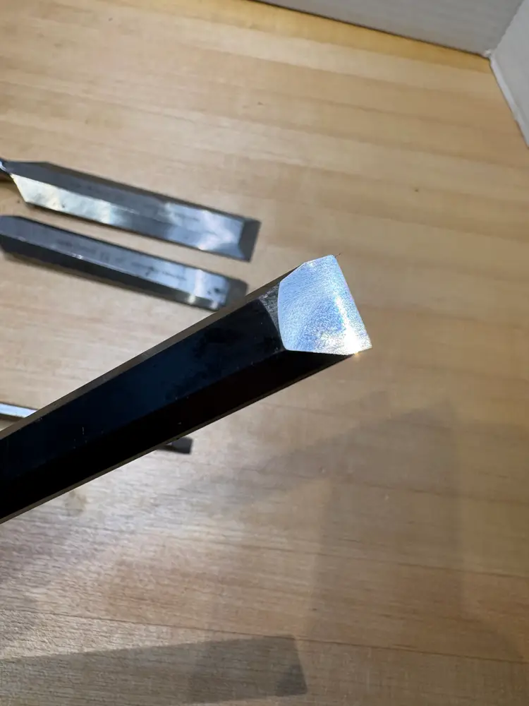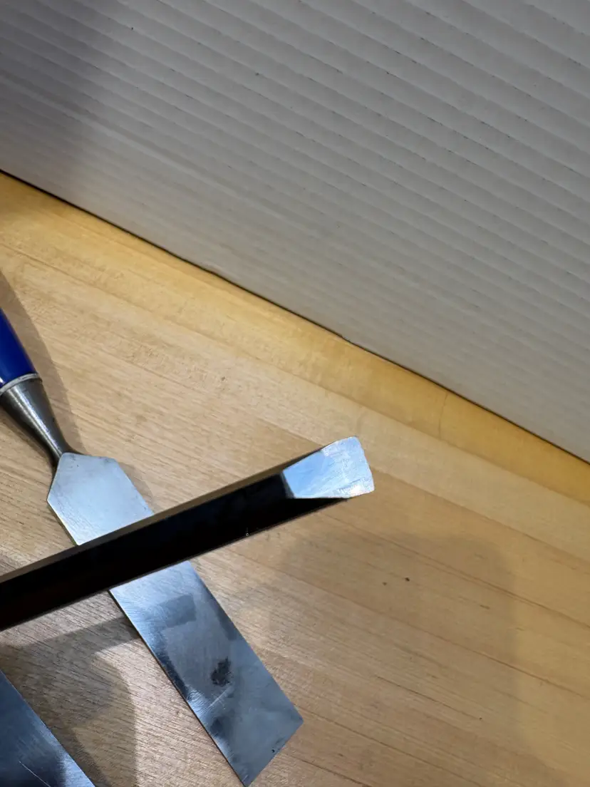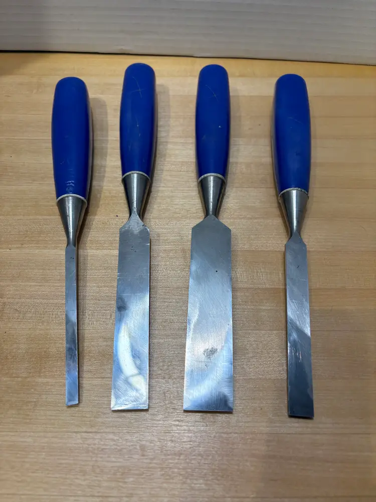 Four vintage blue handled Marples chisels. Sizes 1/4", 1/2", 3/4", 1". Polished the backs and sharpened. I believe these were called "blue chip" Marples.