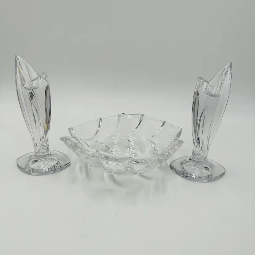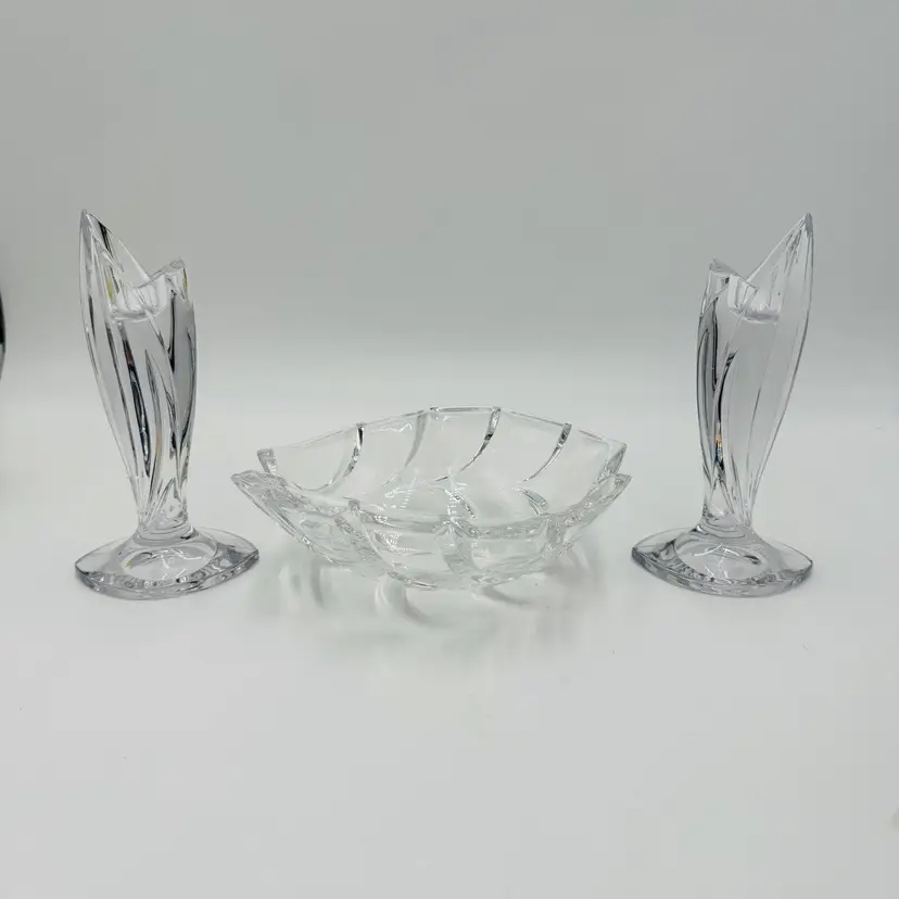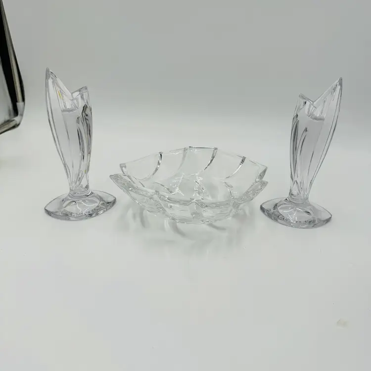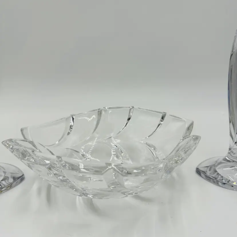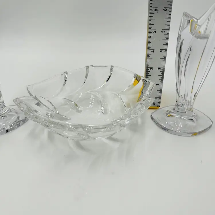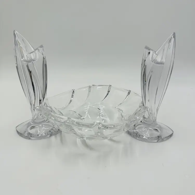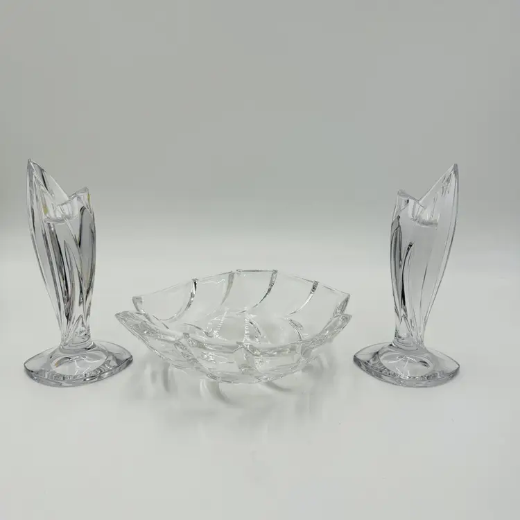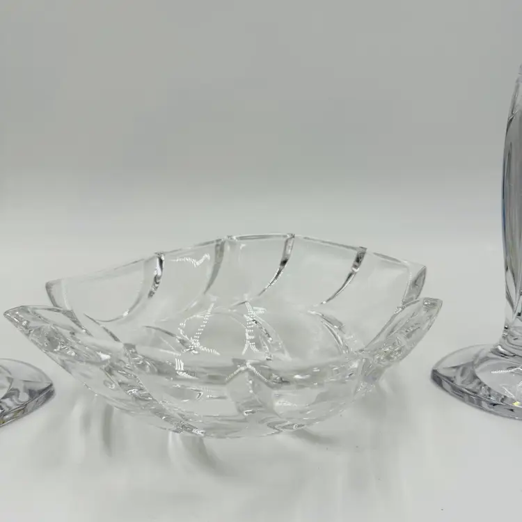 Department: Adult Pattern: Vintage Leaf Item Height: 7 in Number of Items in Set: Three-Piece Occasion: All Occasions Vintage: Yes Country/Region of Manufacture: Austria Origin: Austria Material: Crystal Product Line: Marquis By Waterford Shape: Geometric Brand: Waterford Antique: No Color: Clear Set Includes: Bowl, 2 Candlesticks Original/Licensed Reproduction: Original Backstamp: Printed Theme: Abstract Type: Candlesticks & Bowl