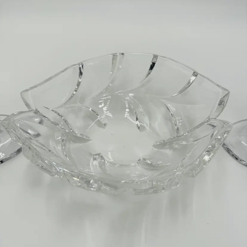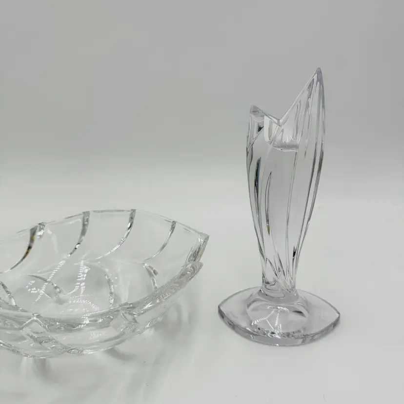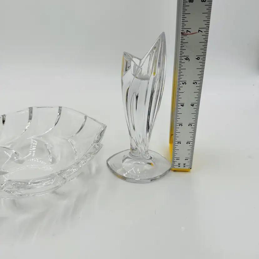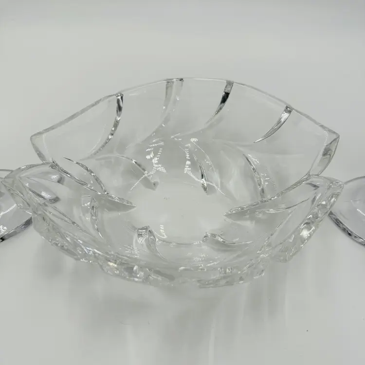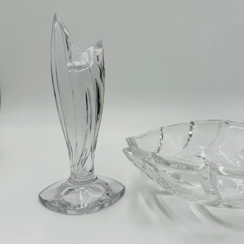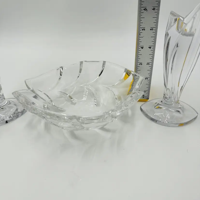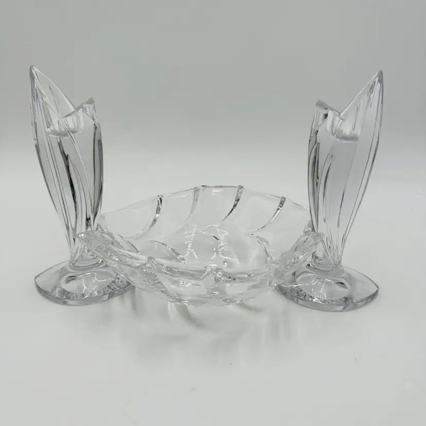 Department: Adult Pattern: Vintage Leaf Item Height: 7 in Number of Items in Set: Three-Piece Occasion: All Occasions Vintage: Yes Country/Region of Manufacture: Austria Origin: Austria Material: Crystal Product Line: Marquis By Waterford Shape: Geometric Brand: Waterford Antique: No Color: Clear Set Includes: Bowl, 2 Candlesticks Original/Licensed Reproduction: Original Backstamp: Printed Theme: Abstract Type: Candlesticks & Bowl
