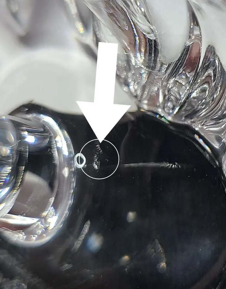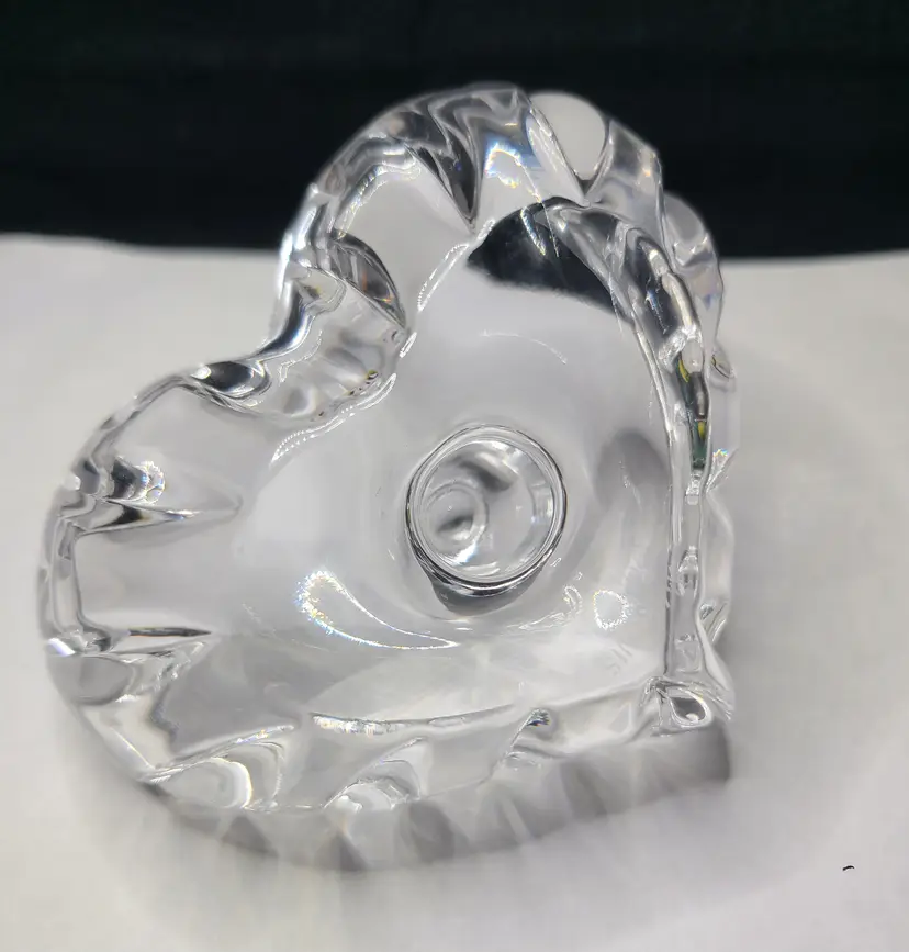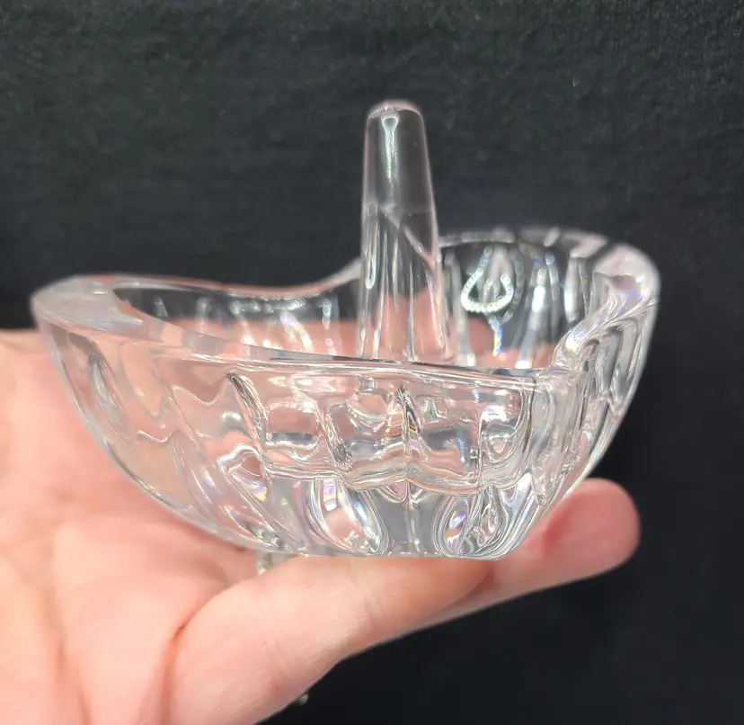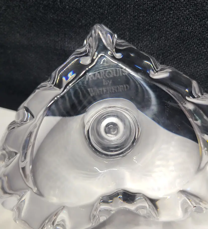 Sparkle-fest goodness! Waterford etching as shown in pic. No chips or cracks. Does have the tiniest 1/8" scratch on the inside bottom as show in pic. I had the hardest time even getting it to show. This piece is approx 3.5" x 3.25" and 2" tall.