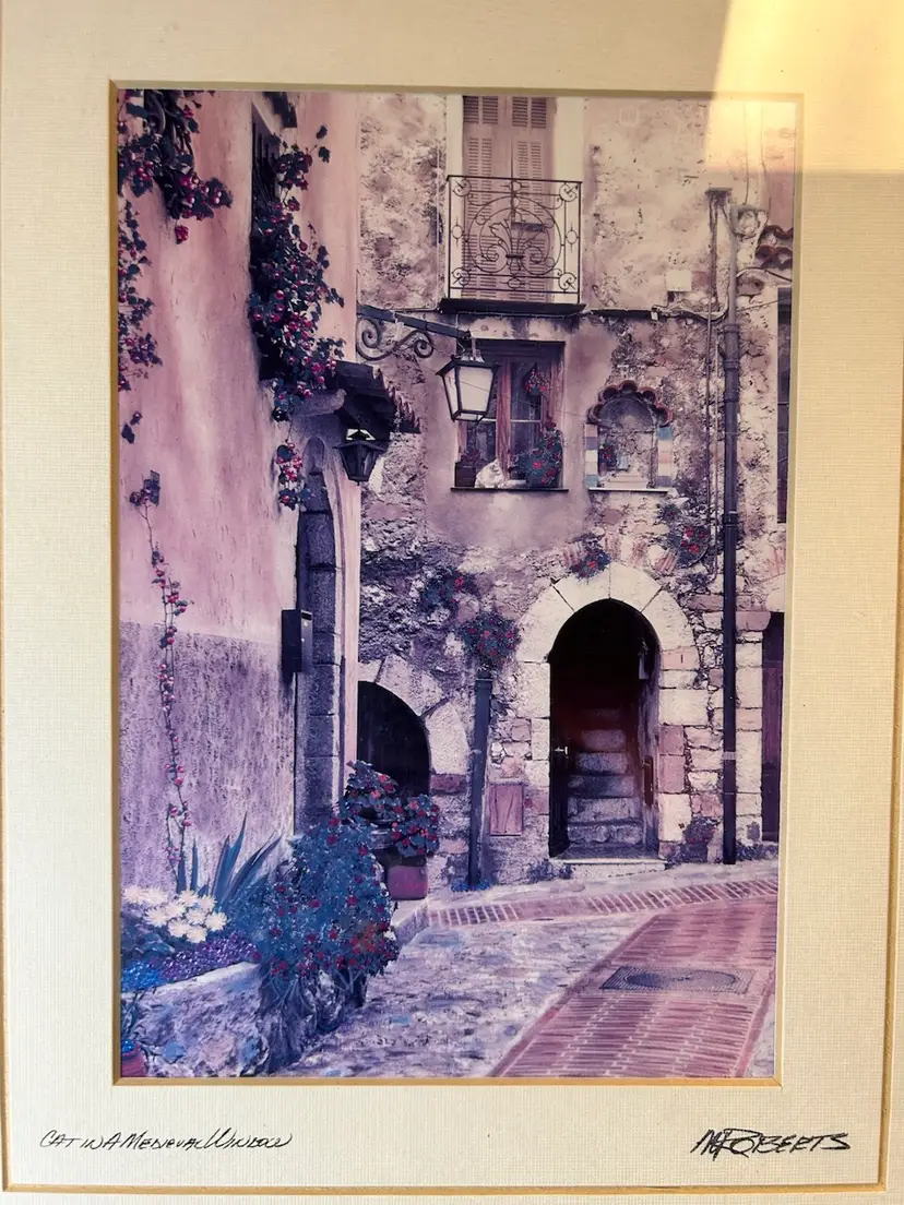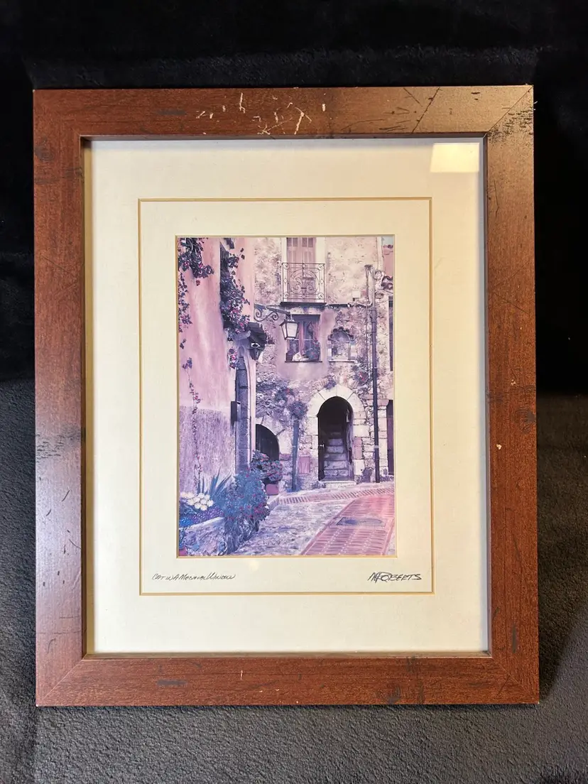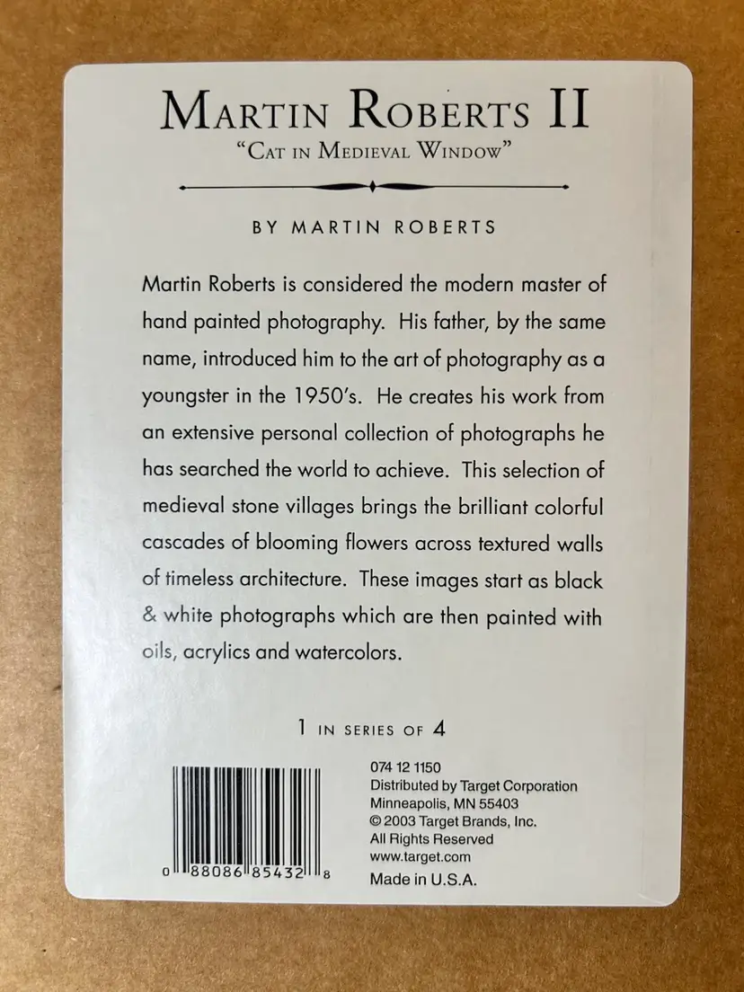 The product is a hand painted framed artwork by Martin Roberts titled "Cat in medieval window." The artwork features a cat in a medieval window scene. Martin Roberts is considered the master of hand painted photography. Frame has a few scratches.