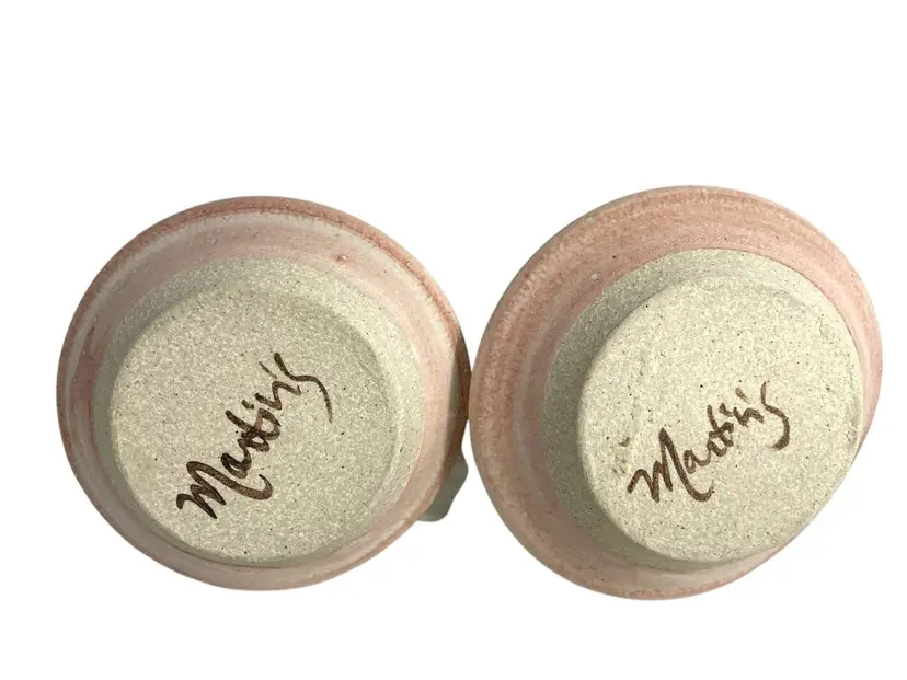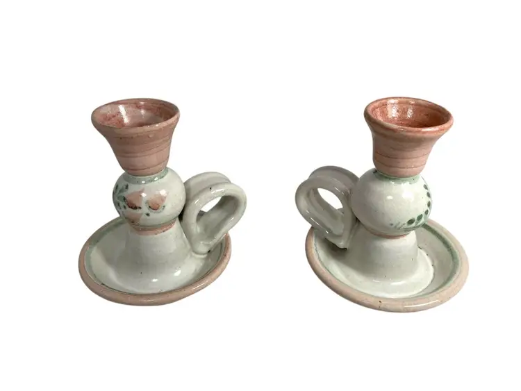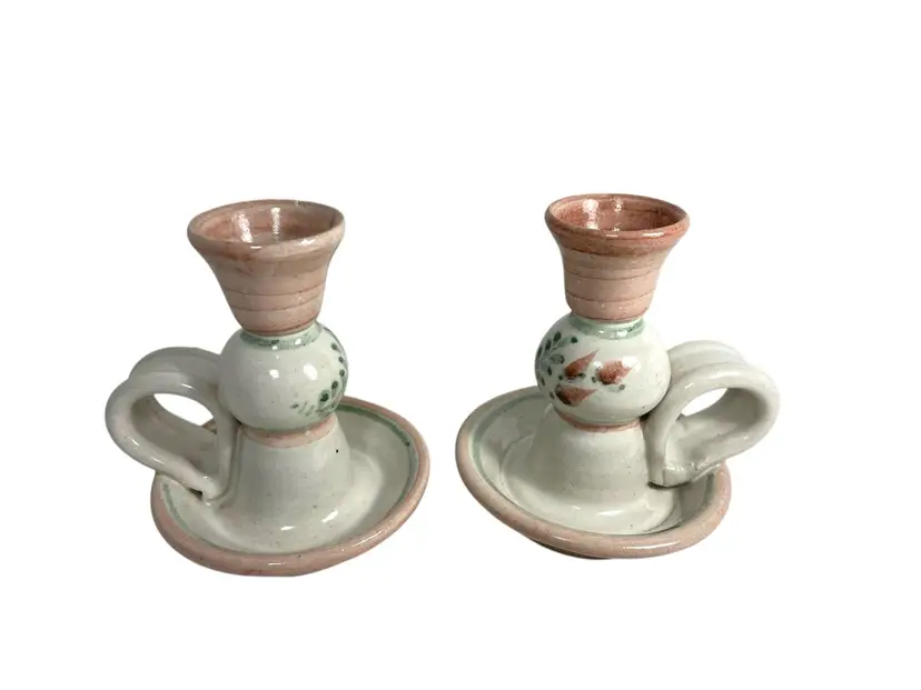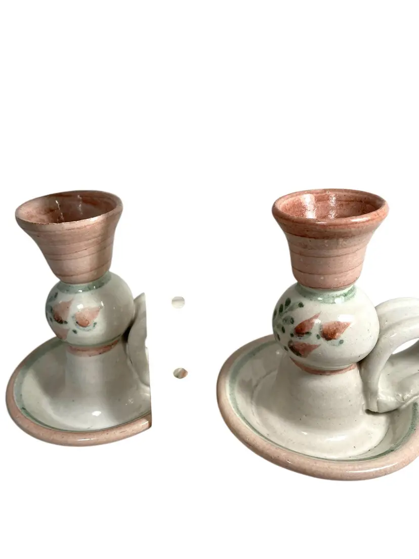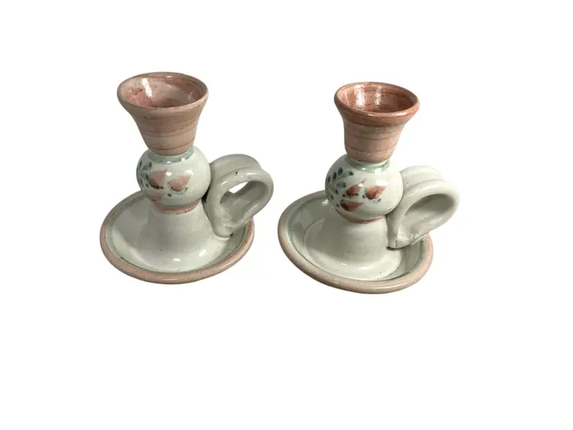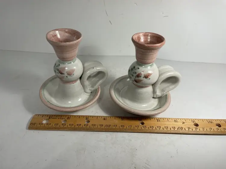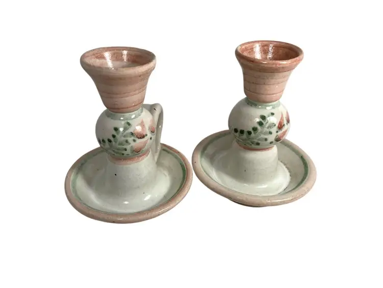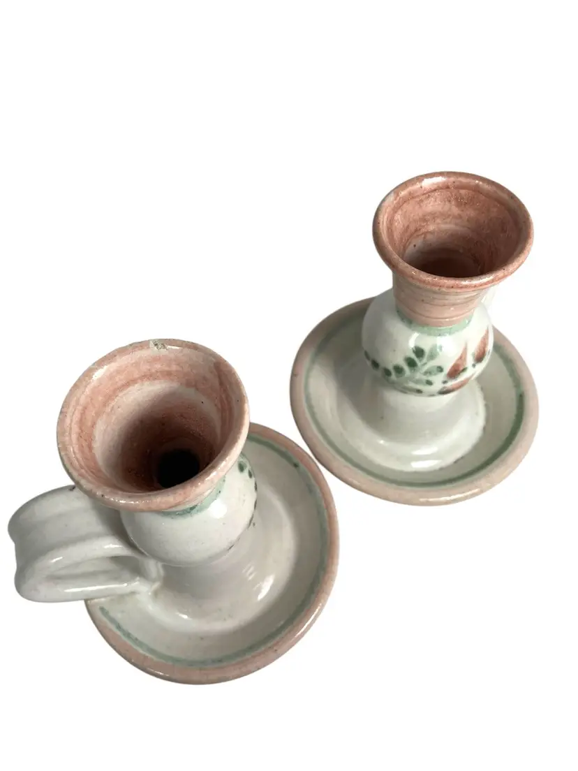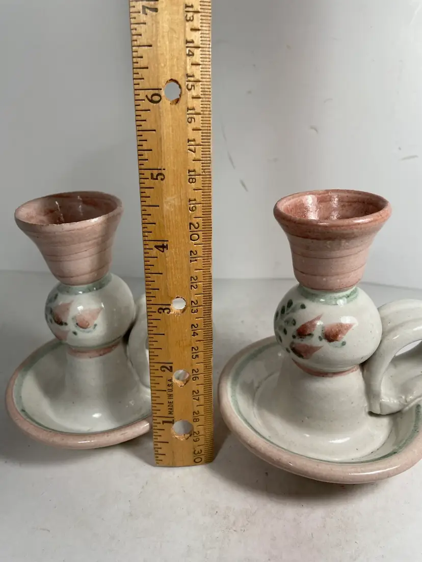 Hand painted. Height 4.25”, base diameter 3.5”, candle opening 1.75”. Flea bite chip on rim of one.