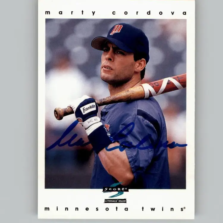 Authentic Score baseball card featuring Marty Cordova of the Minnesota Twins, adorned with his signature in blue ink. A prized collectible for Twins fans and autograph card enthusiasts. Your purchase supports Signatures For Soldiers in helping homeless and disabled veterans.
