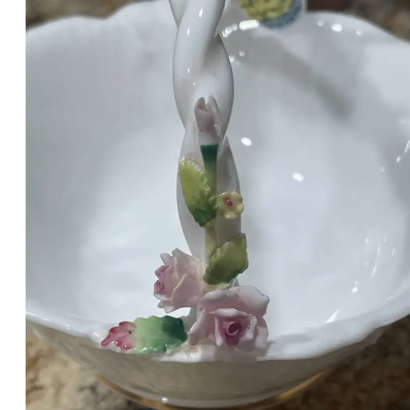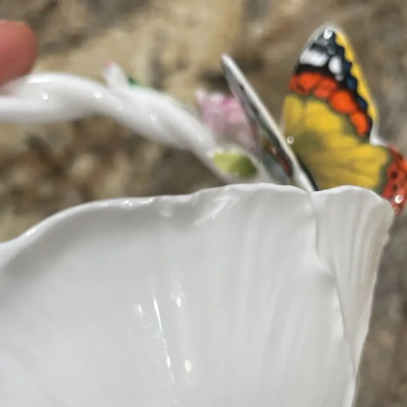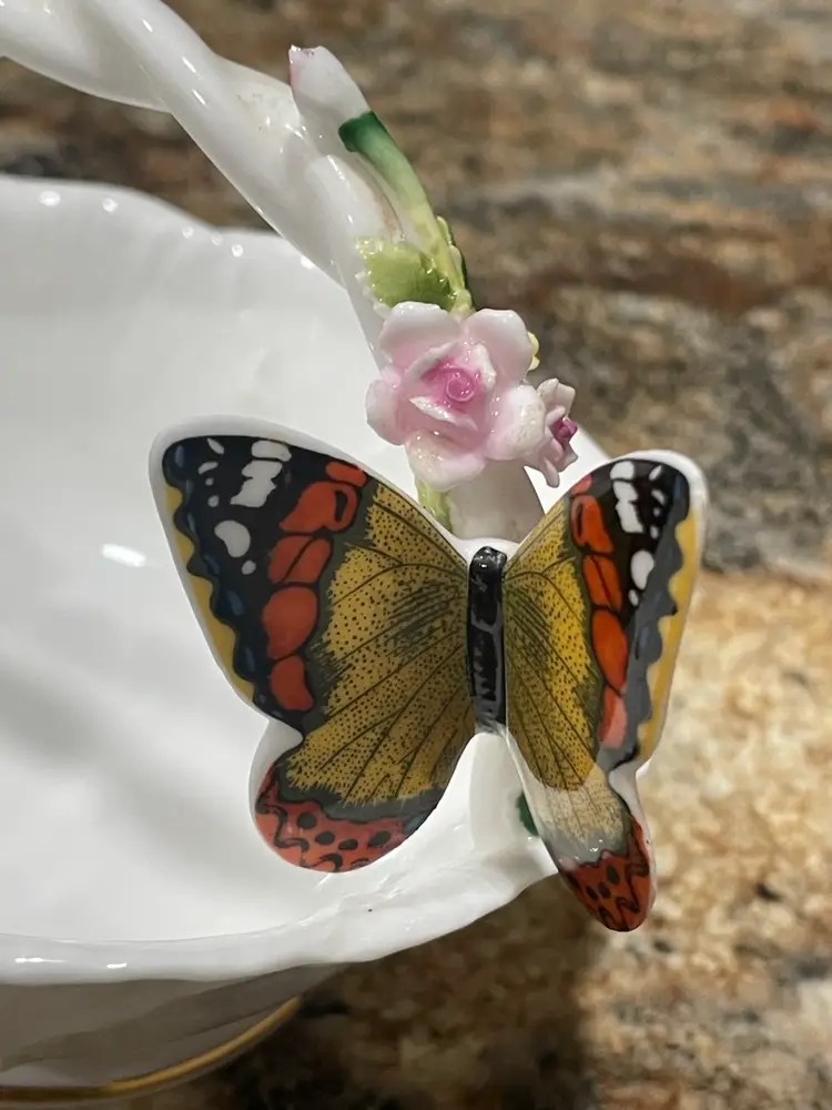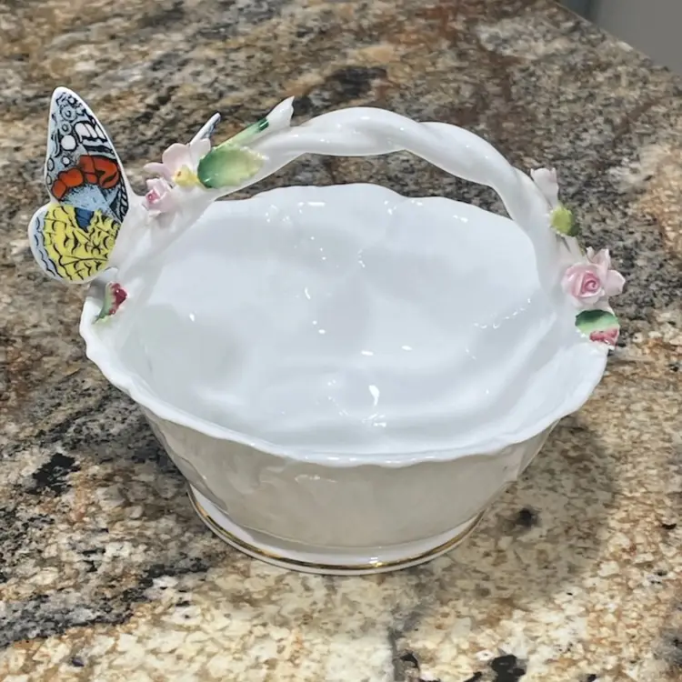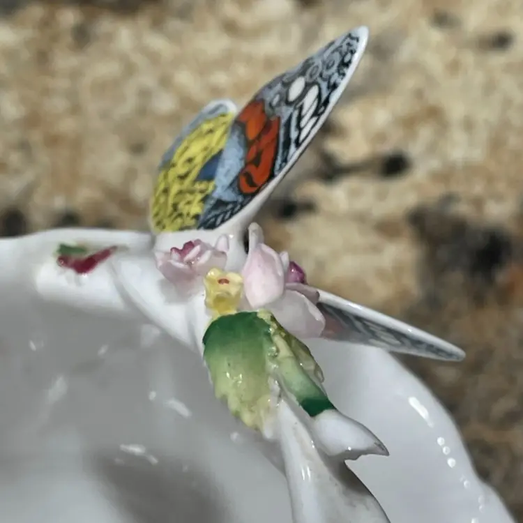 This delicate porcelain trinket dish was produced by Maruri Masterpiece, a Japanese company that created fine bone china decorative pieces primarily during the 1970s and 1980s. The piece features a scalloped edge with gold gilt trim and a colorful three-dimensional butterfly decoration, characteristic of Maruri's attention to detail and craftsmanship. SMALL CHIP - see photo