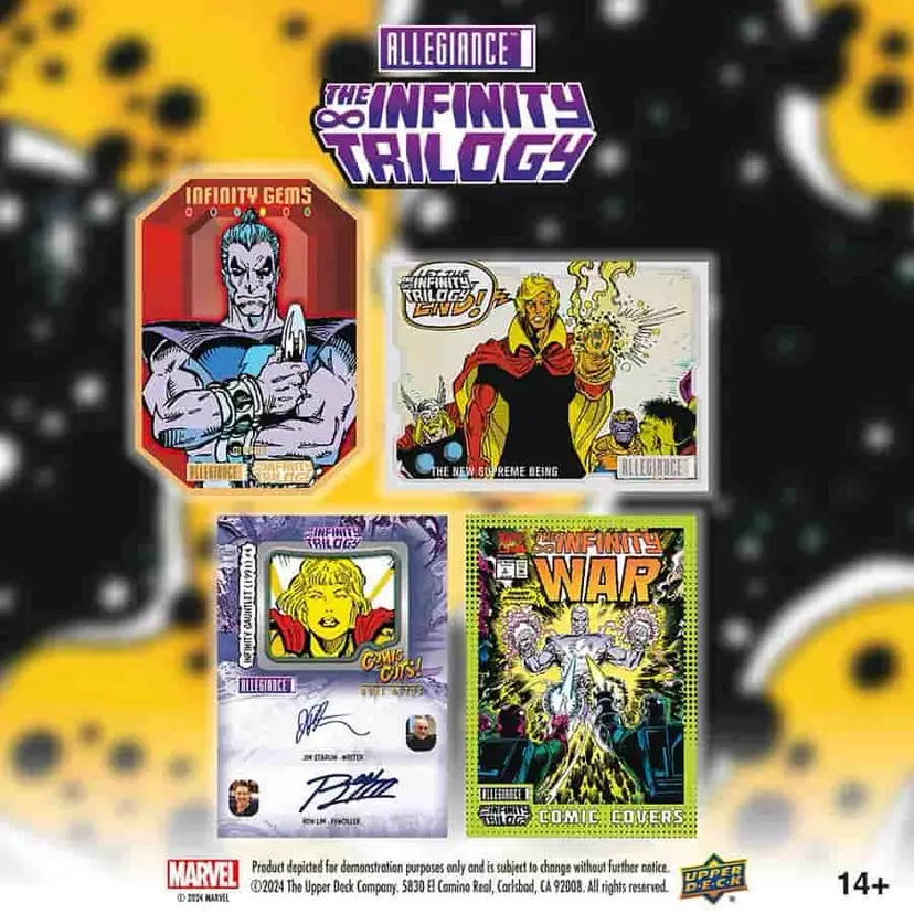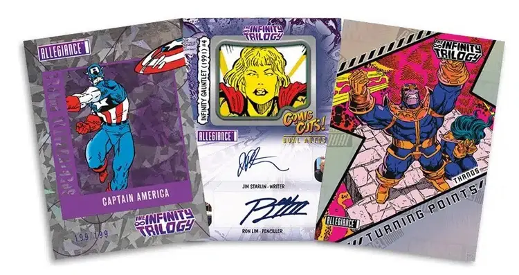 Marvel Infinity Trilogy is the latest storyline to be featured in the Allegiance series. This trading card set highlights brand new thematic inserts, Spectromatic cards, Turning Points holofoil and rare Infinity Gems die-cut insert!