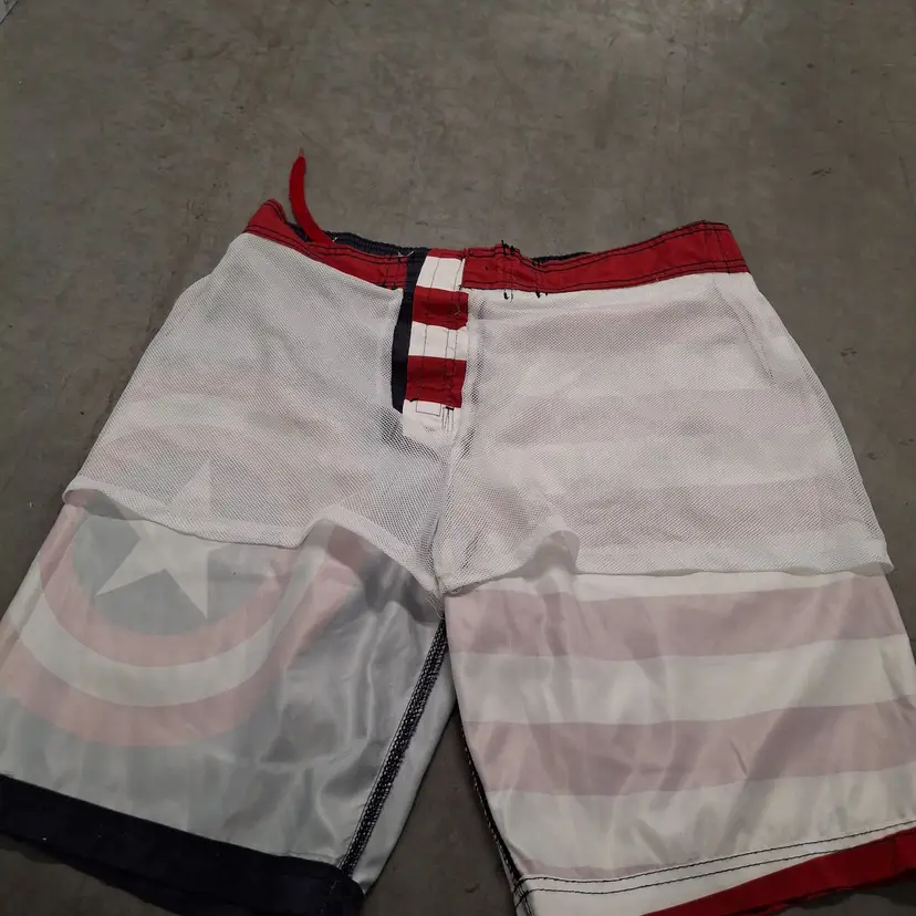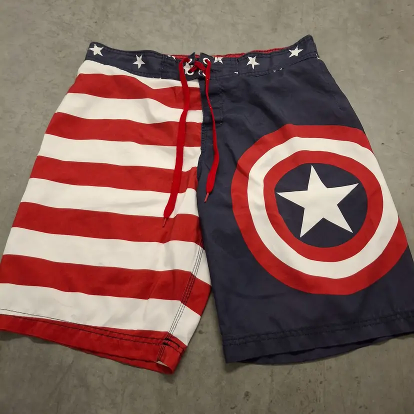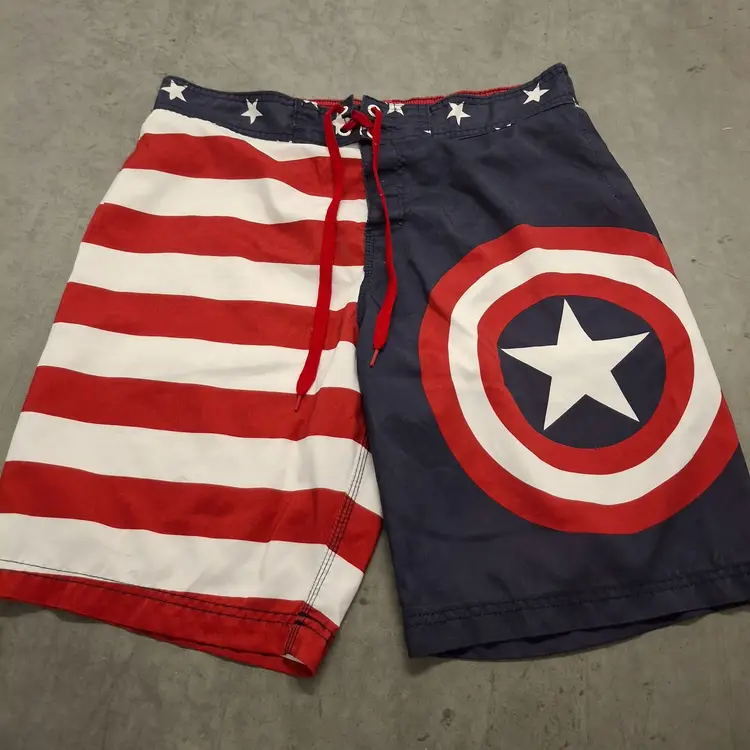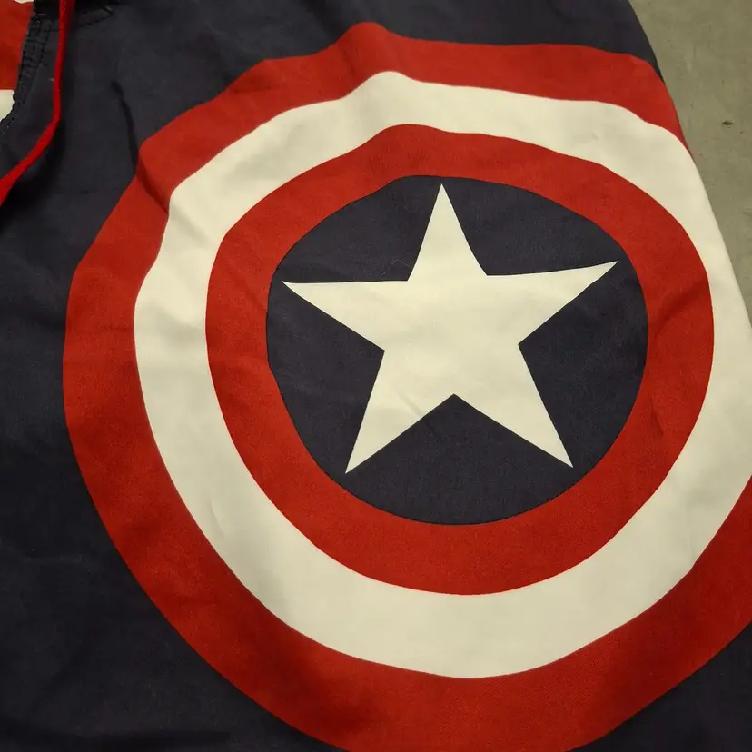 Step into the world of heroism with these Marvel swim trunks. Featuring Captain America's iconic shield and patriotic stars and stripes, they evoke a sense of adventure and freedom. Perfect for embodying the spirit of a hero while enjoying summer days by the water.
