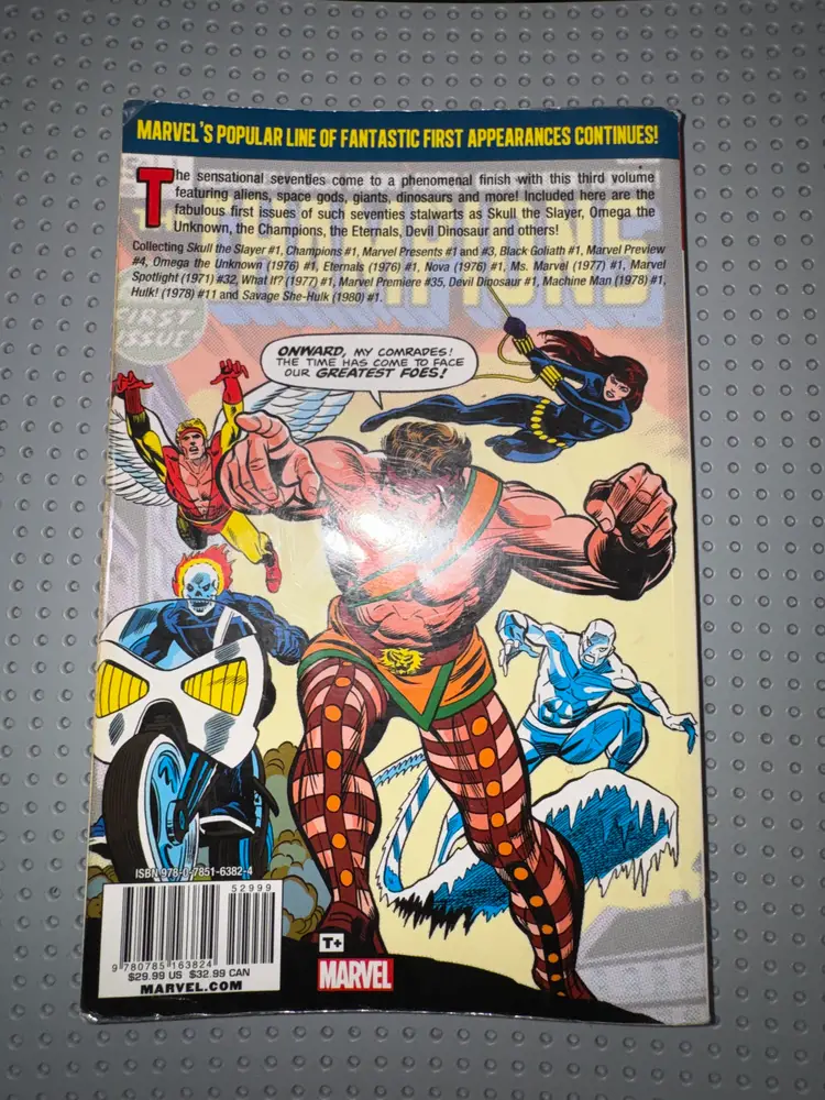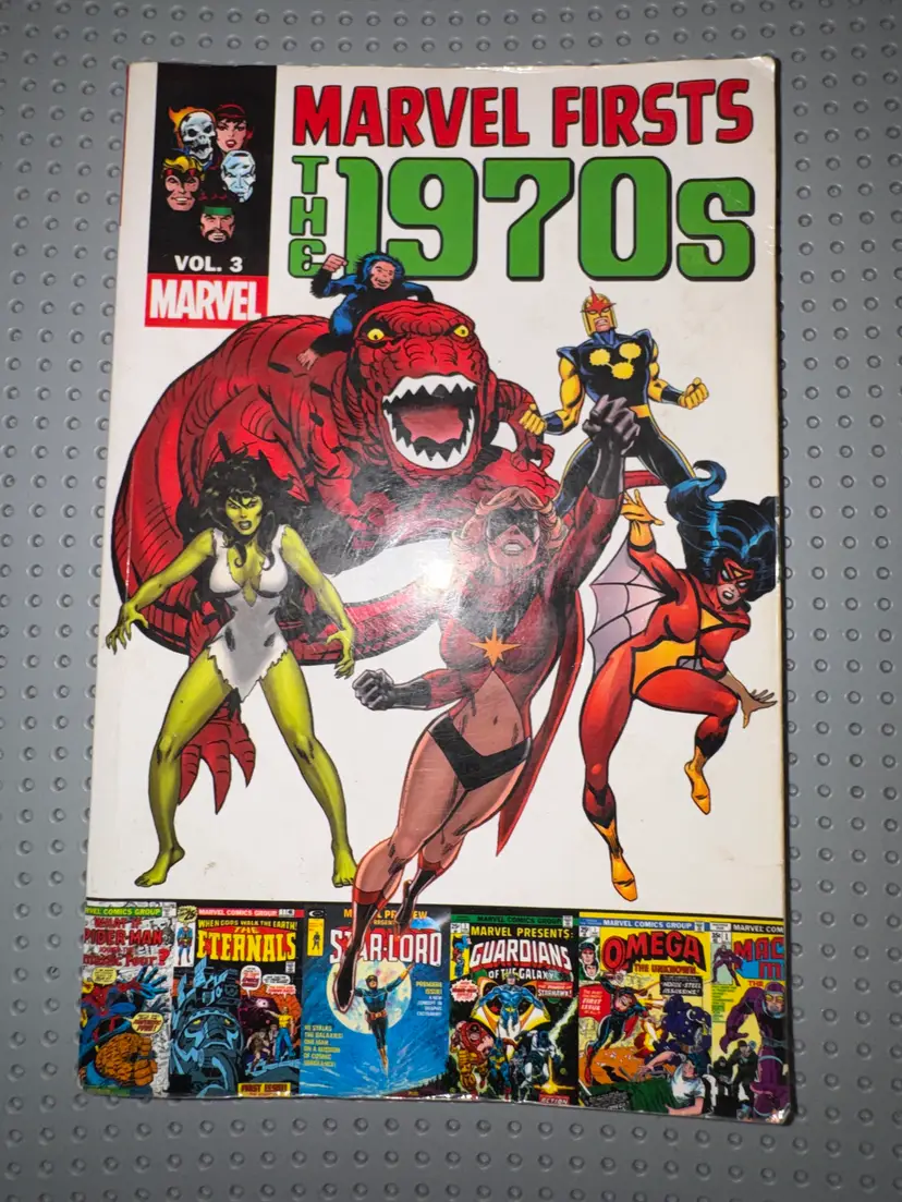 Up for sale is Marvel Firsts: The 1970s, Vol. 3, a trade paperback collection from Marvel Comics that compiles iconic debut issues from the late 1970s. This volume features a colorful montage cover including beloved characters like Devil Dinosaur, She-Hulk, Spider-Woman, Nova, and others, with mini cover reproductions of Star-Lord, Guardians of the Galaxy, Omega, The Eternals, and Machine Man.