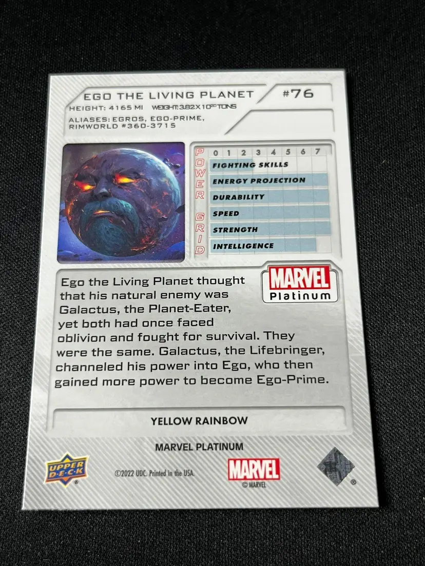 Add some cosmic power to your collection with this 2021 Upper Deck Marvel Platinum Ego The Living Planet Holofoil card! Featuring stunning artwork and a vibrant holofoil finish, this card is a must-have for Marvel fans and collectors. Don't miss out on this galactic gem!