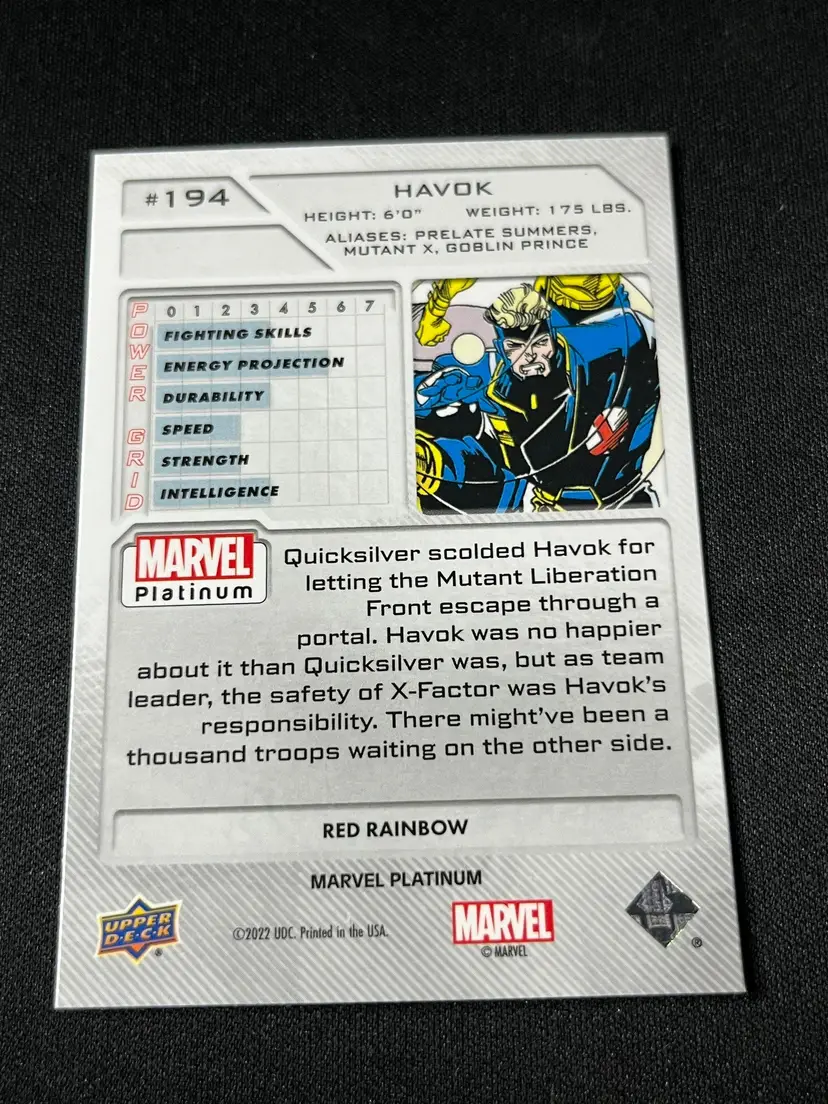 Add some mutant power to your collection with this 2022 Upper Deck Marvel Platinum Havok card! Featuring the iconic X-Factor hero in a dynamic, prismatic design, this card is a must-have for Marvel fans and collectors. Don't miss out on this electrifying addition!
