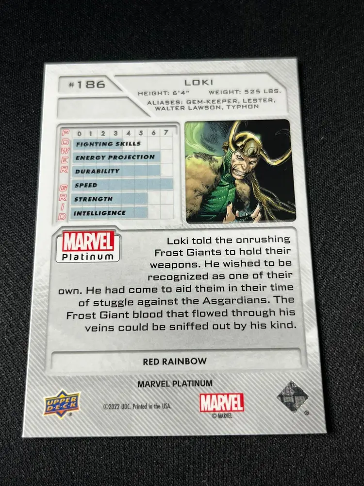 Add some mischief to your collection with this Marvel Platinum Loki card from Thor (2007) #12 by Upper Deck. Featuring the God of Mischief in a stunning prismatic design, this card is a must-have for any Marvel fan or collector. Don't miss out on this iconic piece!
