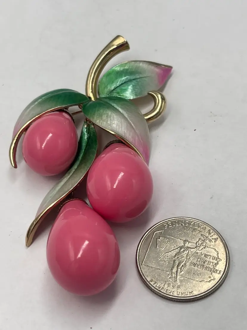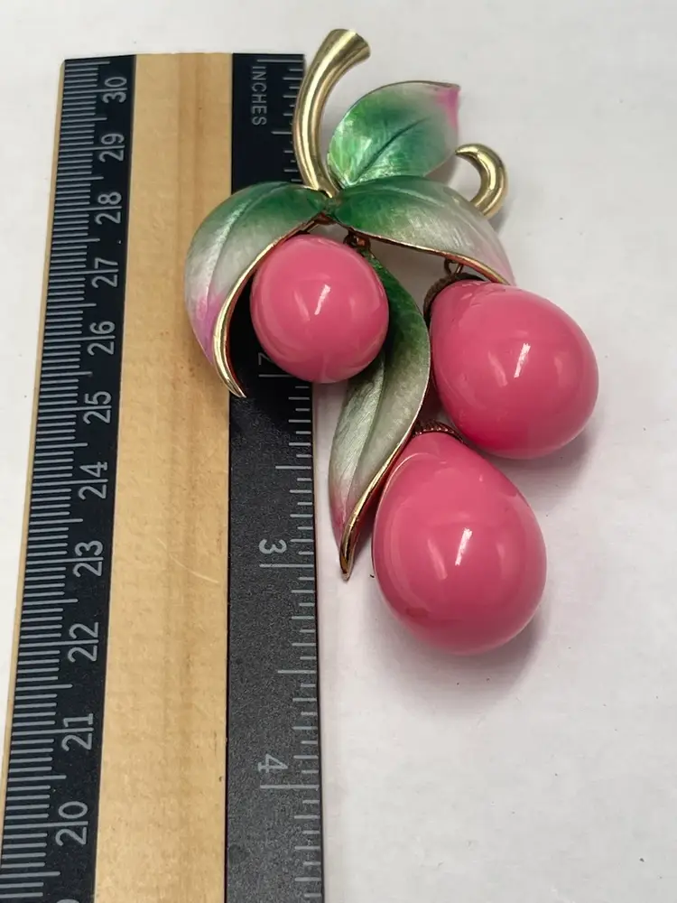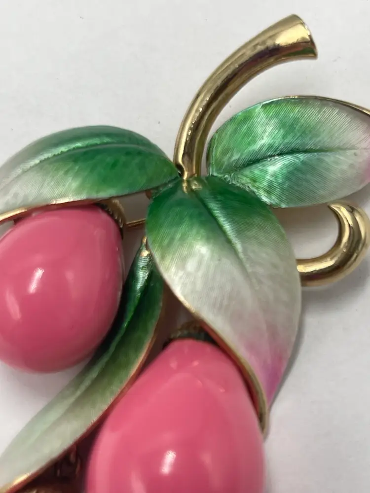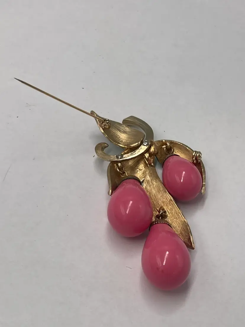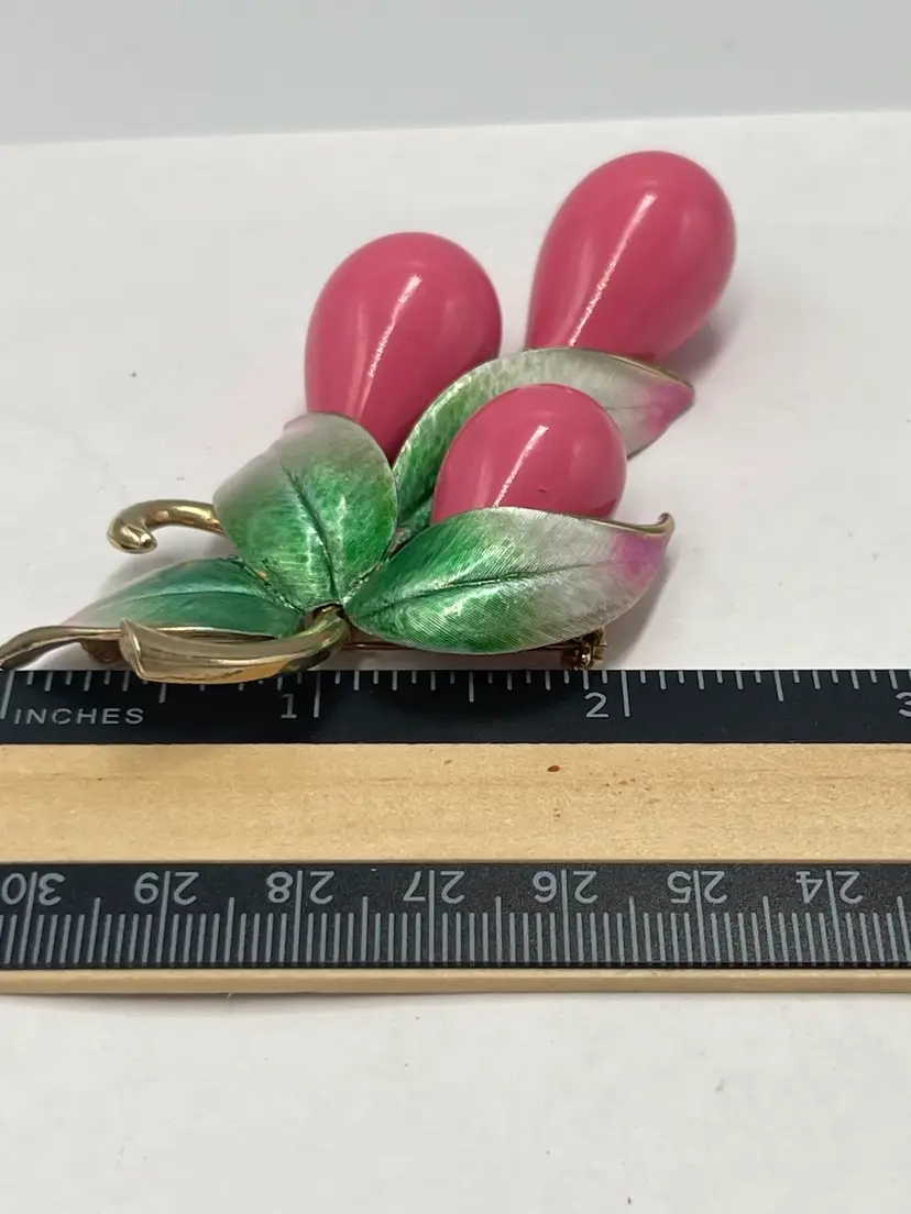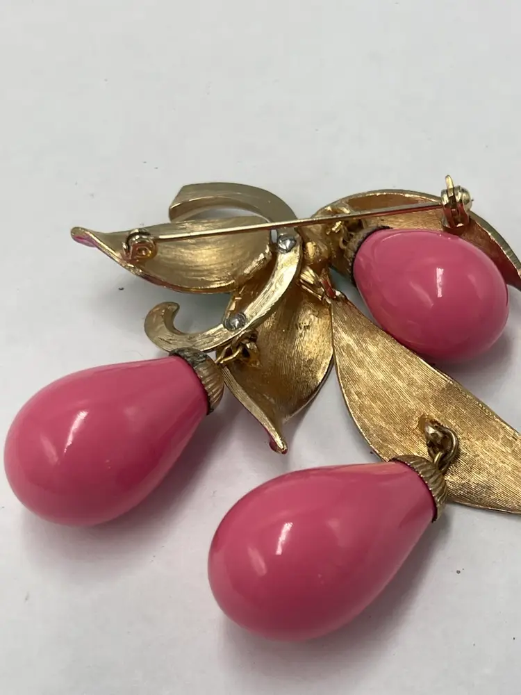 Marvella vintage unsigned brooch. Pink lucite dangles paired the ombré enamel leaves colored from green to pink. Approximate measurements 3.5 X 2.5 inches. Slight wear on back of brooch and caps attached to dangles.