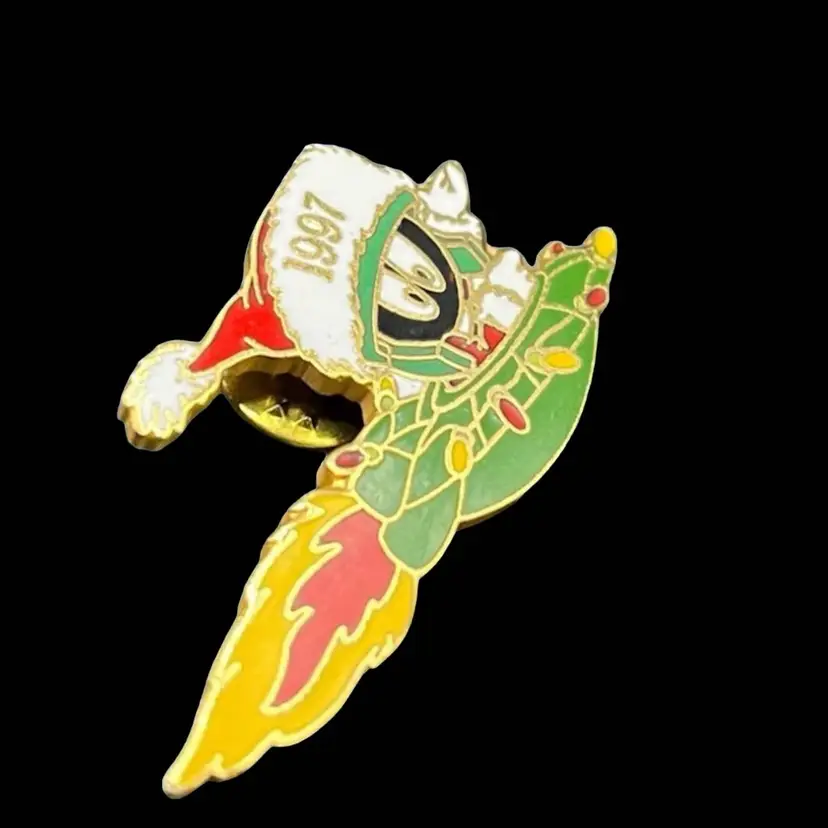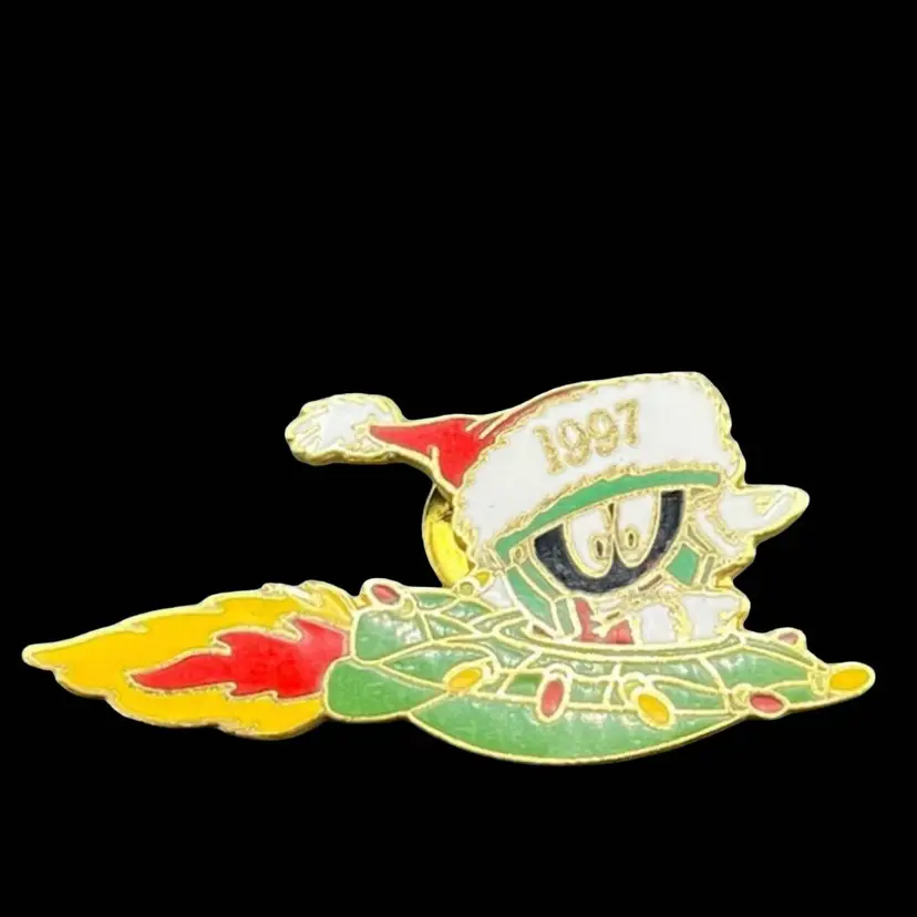Marvin the Martian wearing his holiday hat, speeding along in his festive decorated spaceship. In good vintage condition. Approximately 2” across