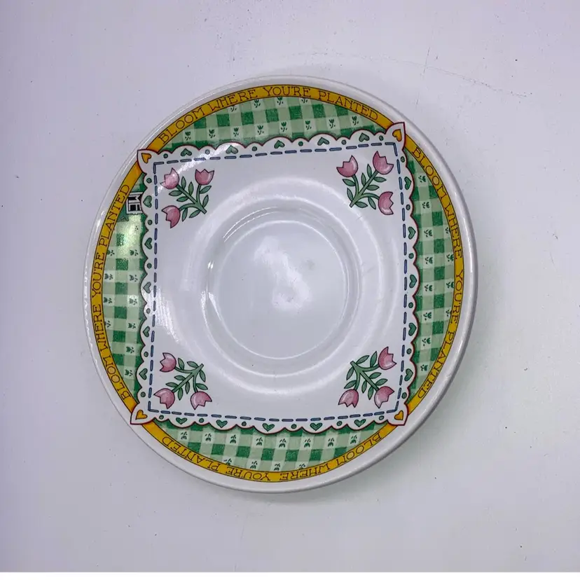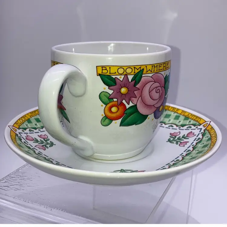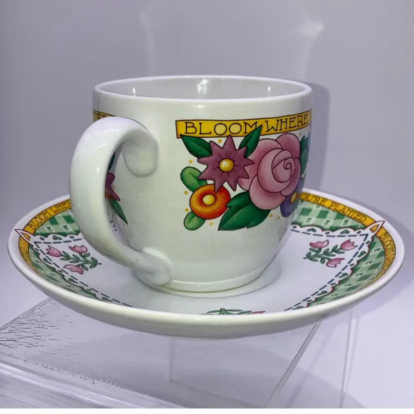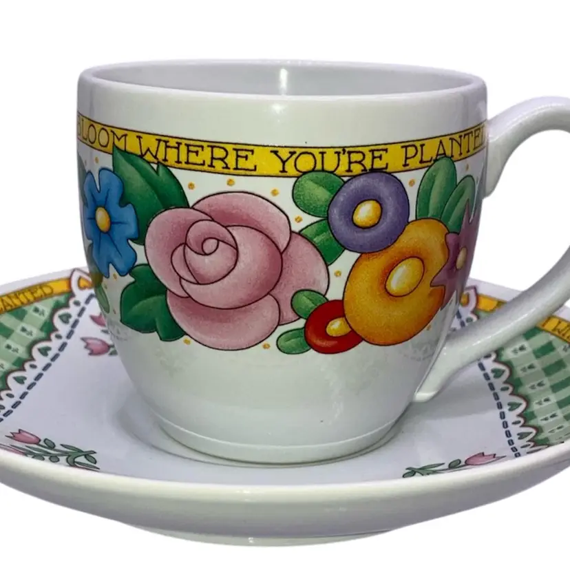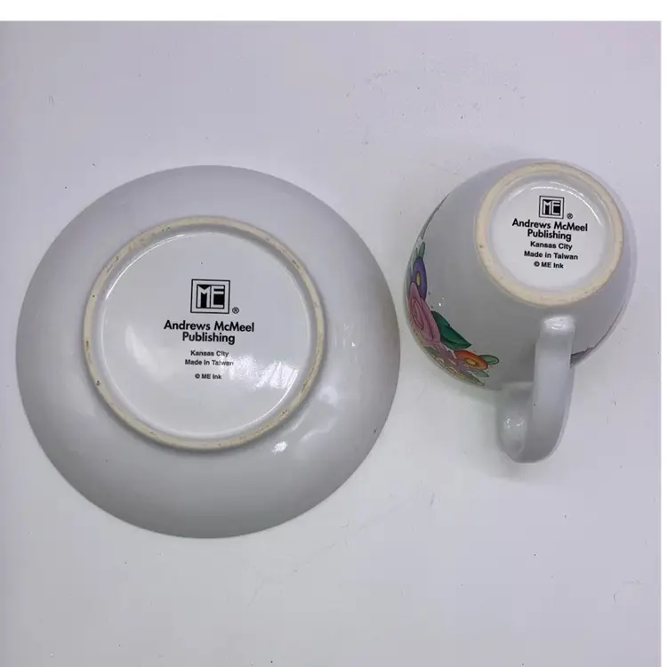 Small capacity cup and saucer are classic ME Ink. Perfect as a planter!!! No cracks. One chipped area on saucer bottom is pictured. 7 oz. cup. 6” saucer.