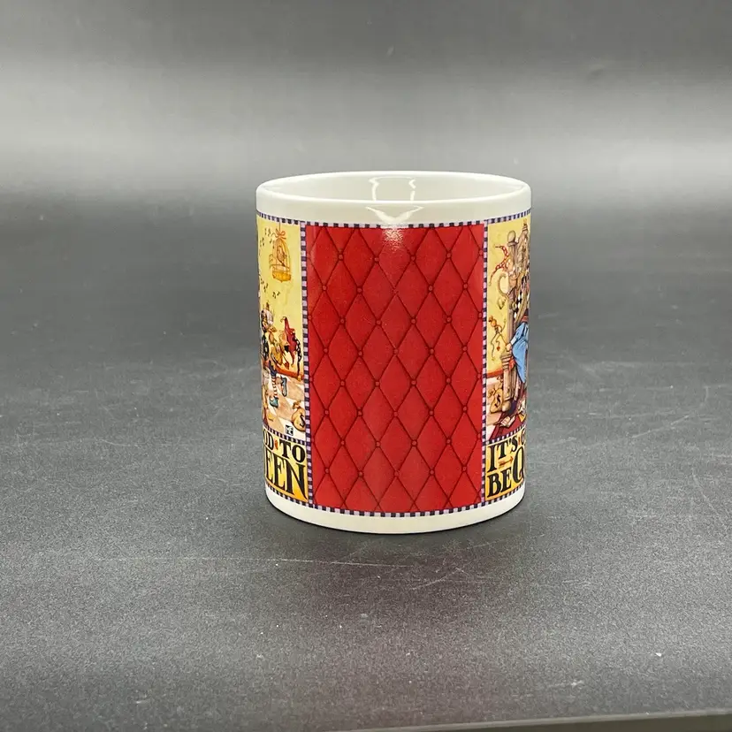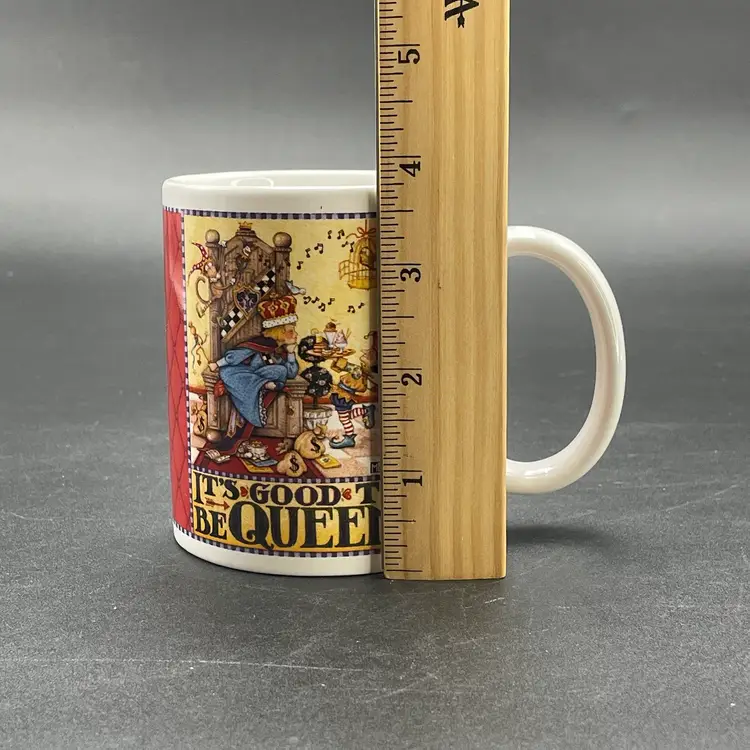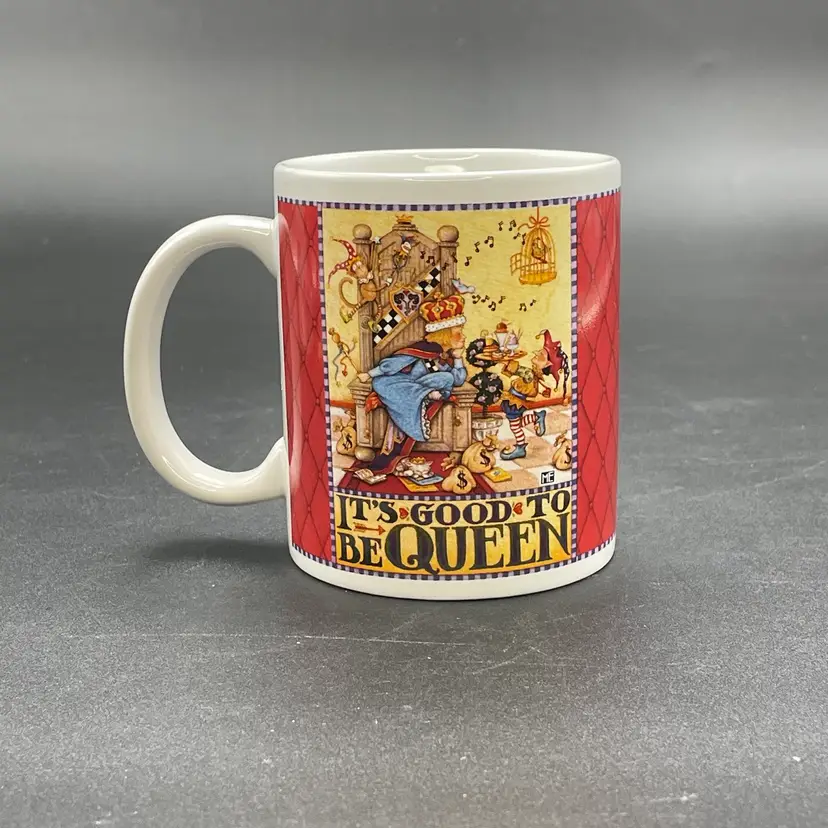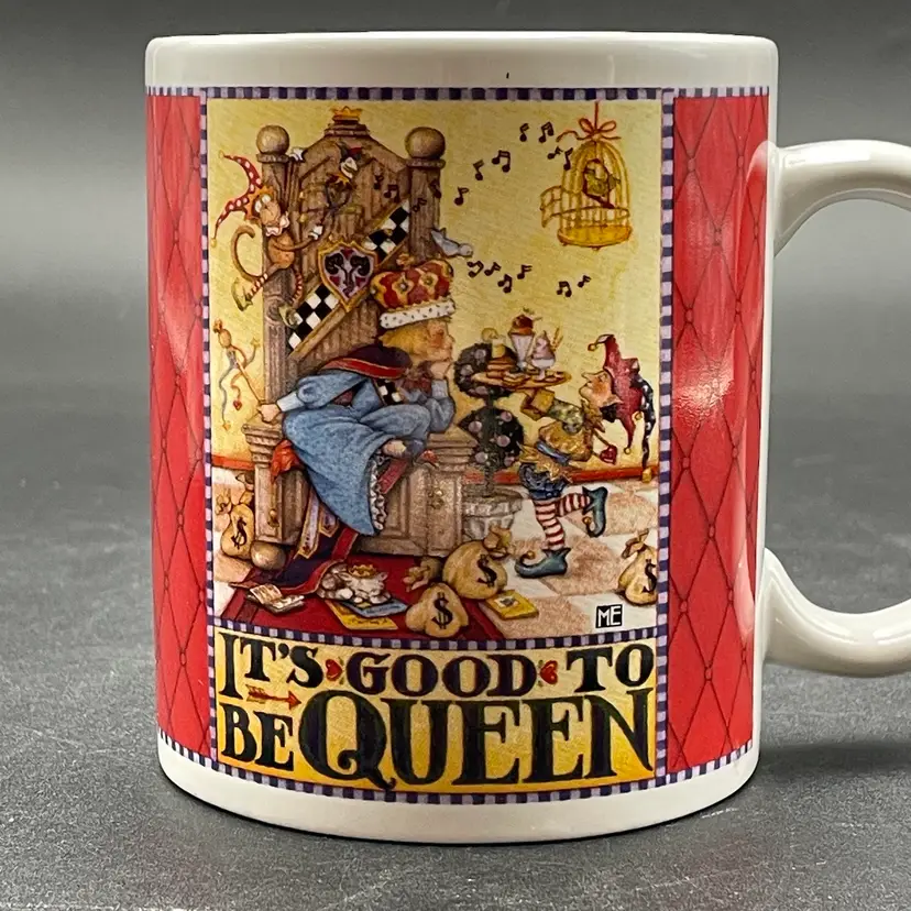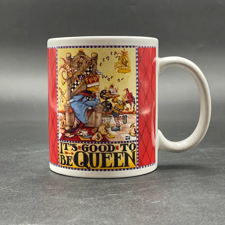 This is a vintage Mary Engelbreit "It's Good To Be Queen" coffee mug. Measures approximately 3.75" tall x 3" across the top, and holds approximately 12fl oz. Dishwasher and microwave safe. No major flaws.