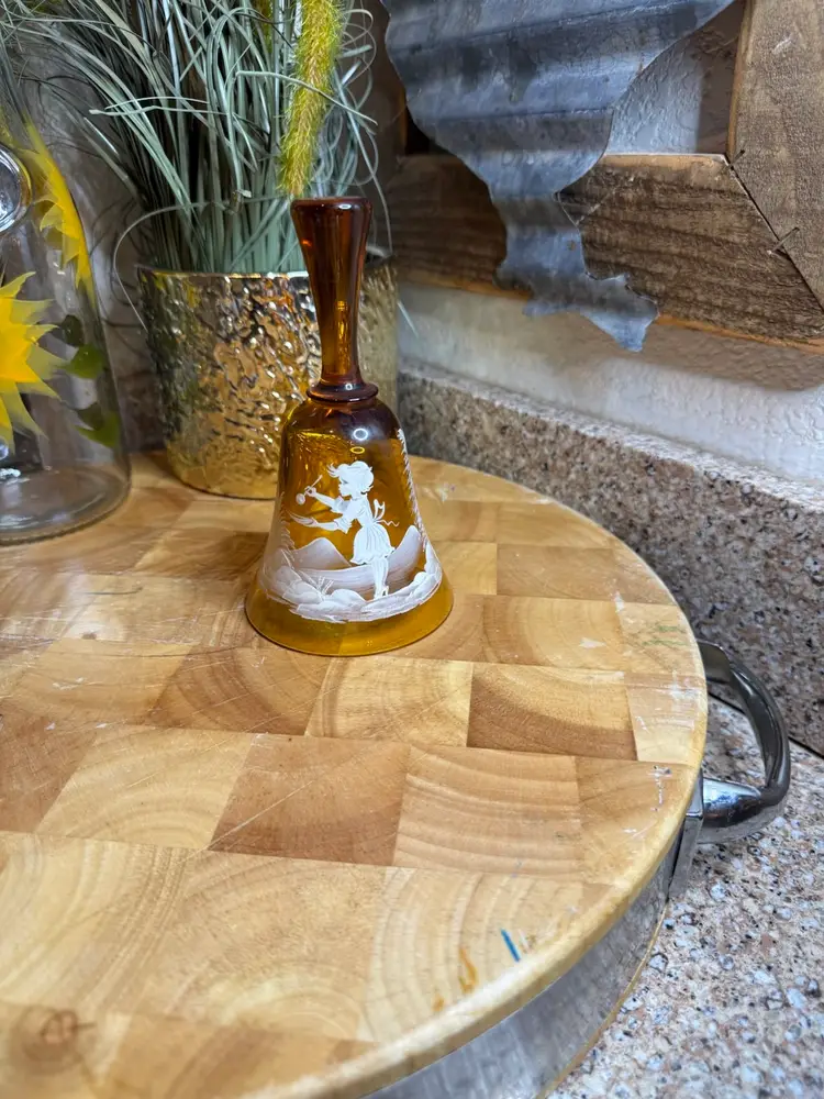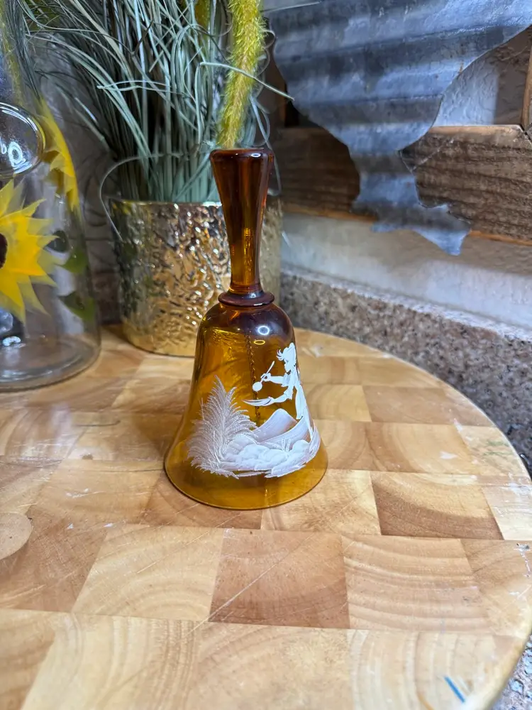 Details: • Amber glass bell • Mary Gregory style white enamel child motif • Victorian-inspired design • Clear crystal clapper • Approx. size: (add measurement) • Condition: No chips or cracks