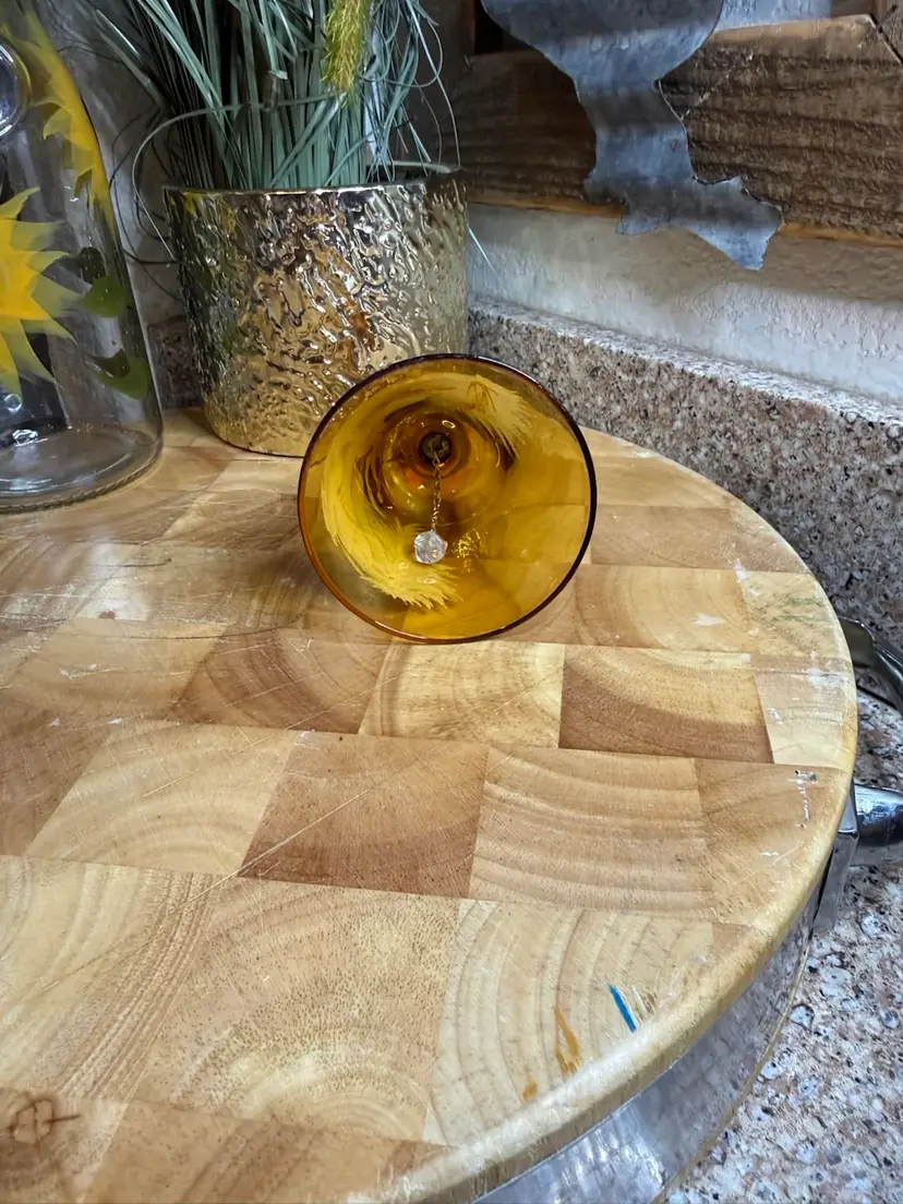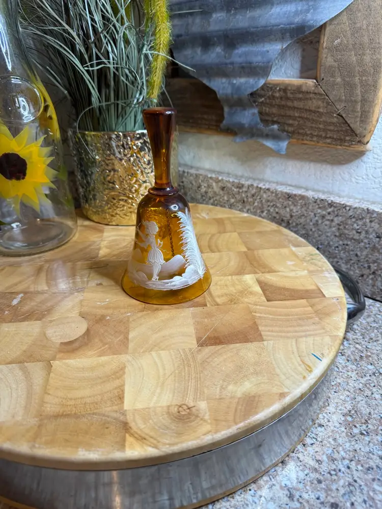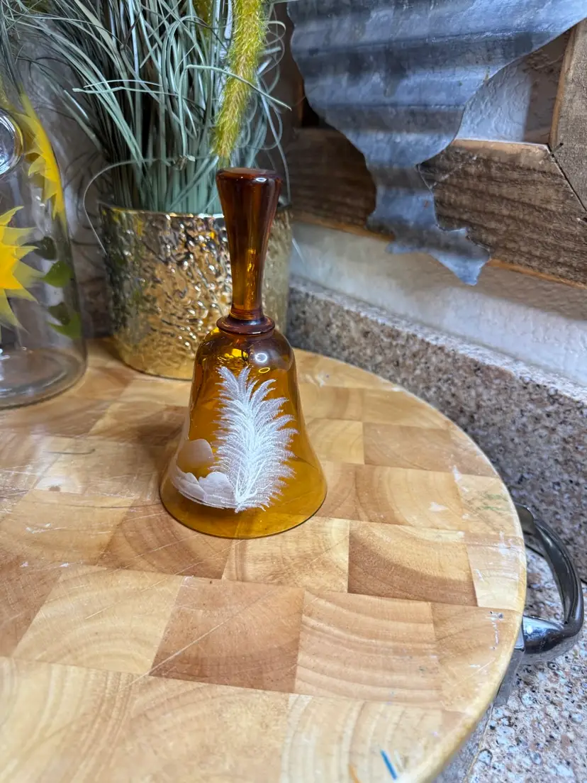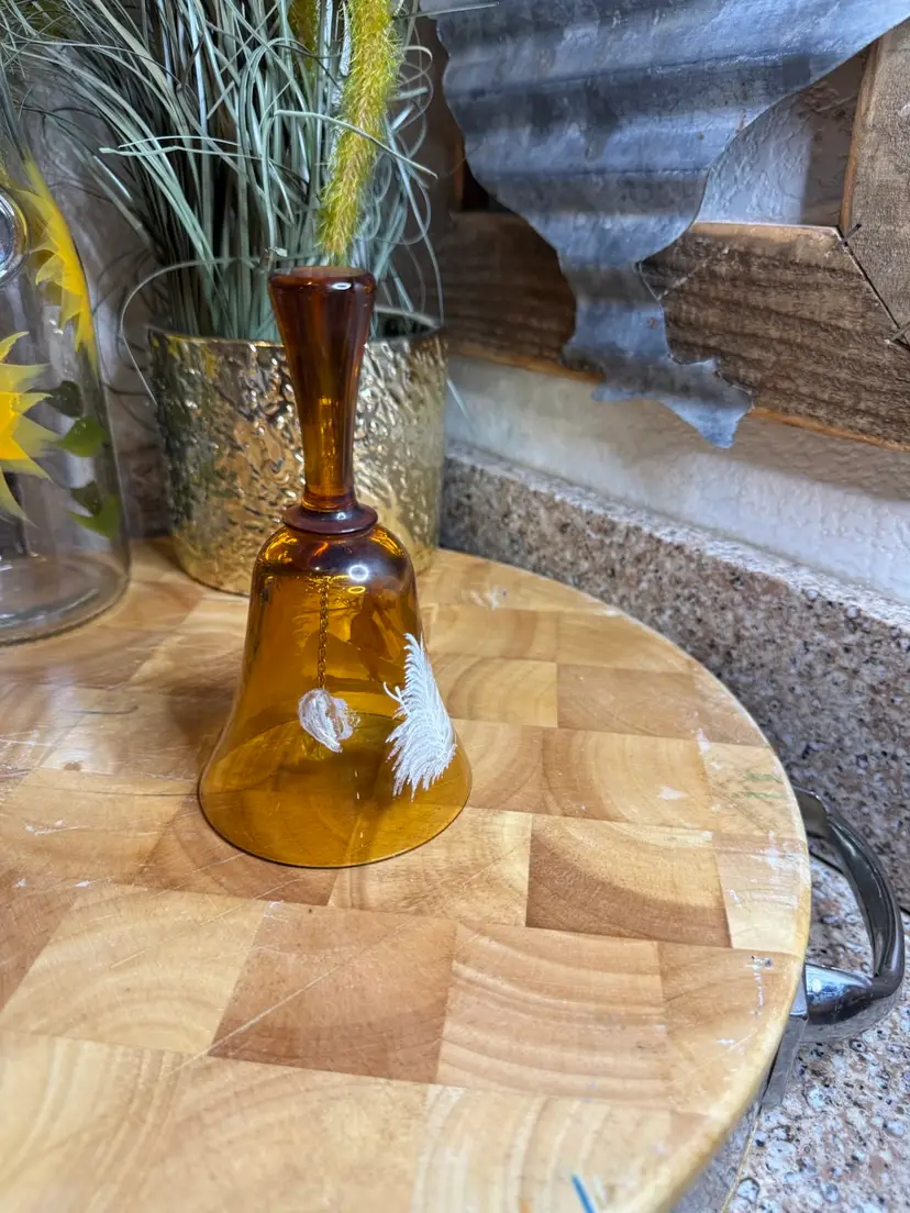 This Mary Gregory style amber glass bell captures that moment in delicate white enamel, a quiet silhouette frozen in time. The warm honey-colored glass glows like late afternoon sunlight, while the gentle ring of its crystal clapper echoes like a memory carried on the breeze.