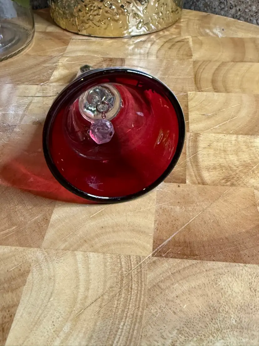 Details: • Ruby/cranberry glass bell • Mary Gregory style white enamel design • Victorian-inspired motif • Clear clapper • No chips or cracks