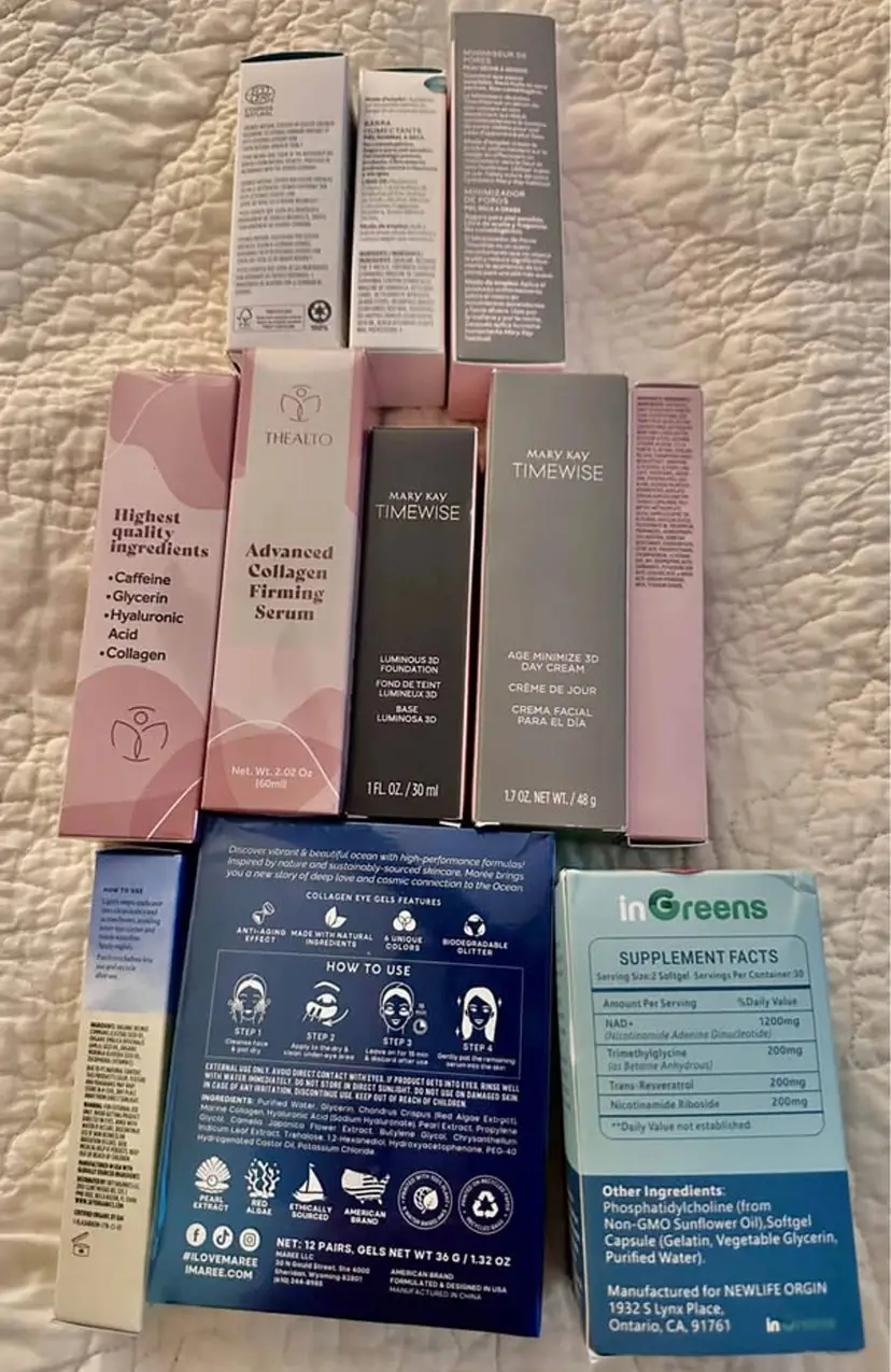 Like New - Never Used 8 Mary Kay Timewise and Naturally Anti-Aging Products Mary Kay Organic Eyebrow & Lash Oil Maree Marine Colleen eye masks In Greens Liposomal NAD+ Supplement