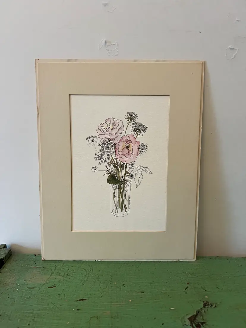 Signed lithograph by Mary Lou Goertzen "Wild Roses" This print is behind a mat. No other frame. Over all dimensions are 10x8" Mat opening is 4.75" x 6.75" Some aging. The edges of the mat have some bumps and bruises