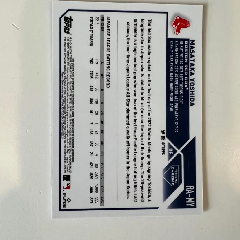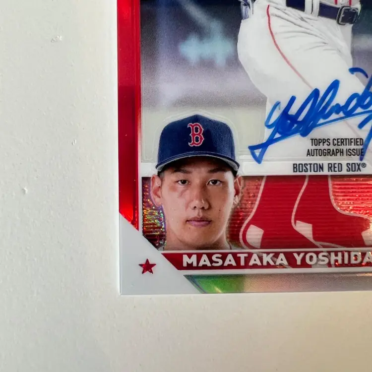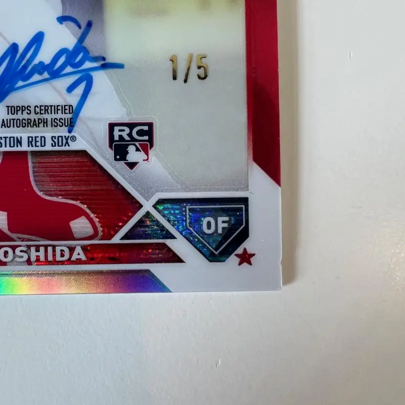 Thanks for checking out my listing. Offers are on. Feel free to direct message me @bioduediligence on Twitter or Discord This is one of the top chase cards in 2023 Topps Chrome - the True Red rookie auto of Japanese star and potential AL ROY Masataka Yoshida. The card # is RA-MY and this Red Sox color-matched ultra rare parallel is serial numbered 1/5. This card is in ungraded near mint condition. Please examine the pictures carefully and ask any questions or request additional information before purchasing or making an offer. Shipping will be via USPS Priority Mail unless other arrangements are agreed upon. Card is in a one-touch and will be carefully packaged in a box and sent with full insurance.