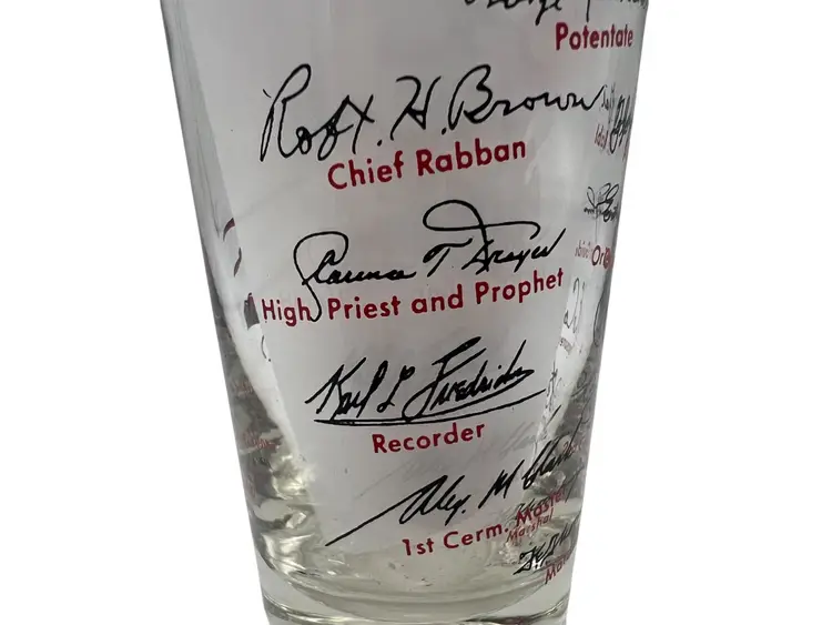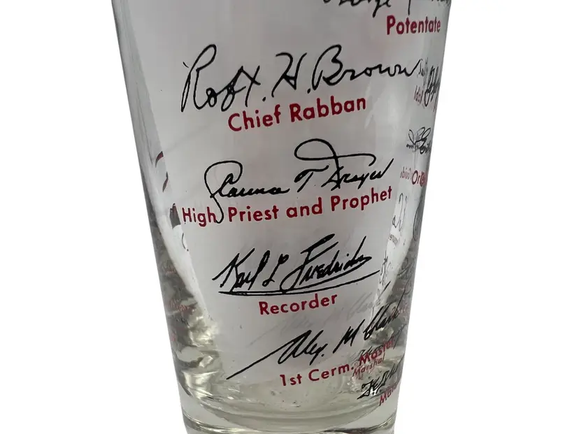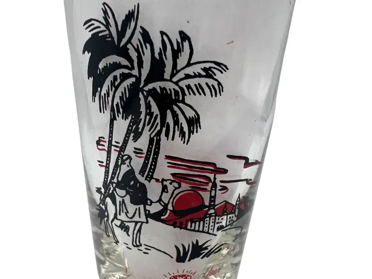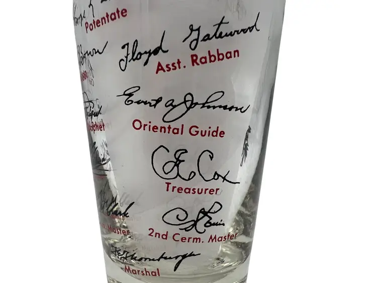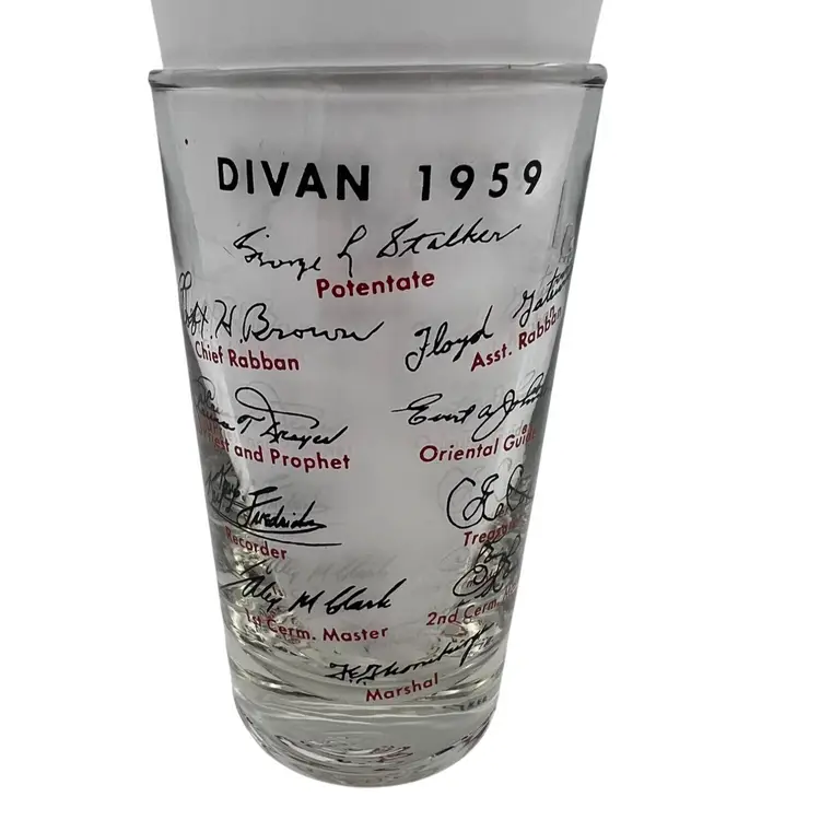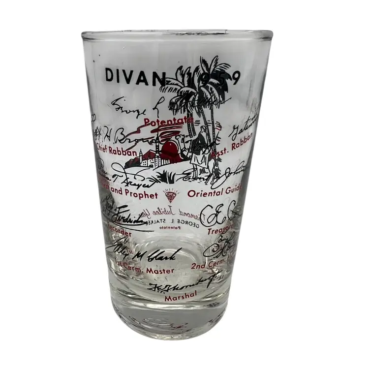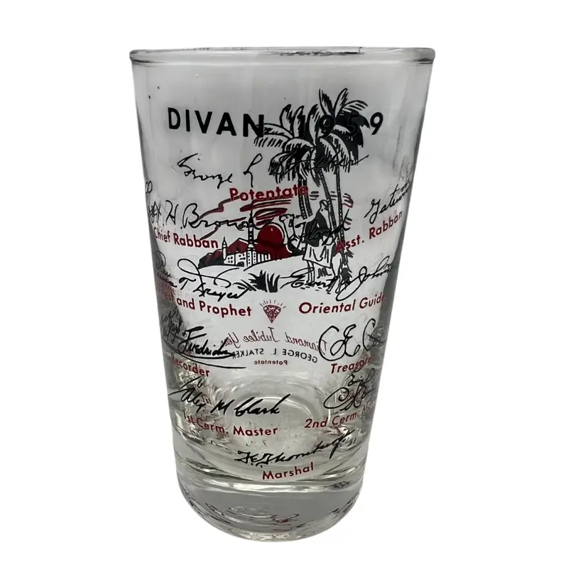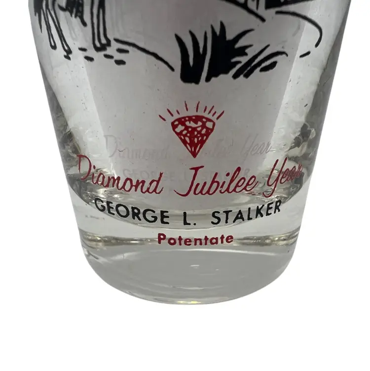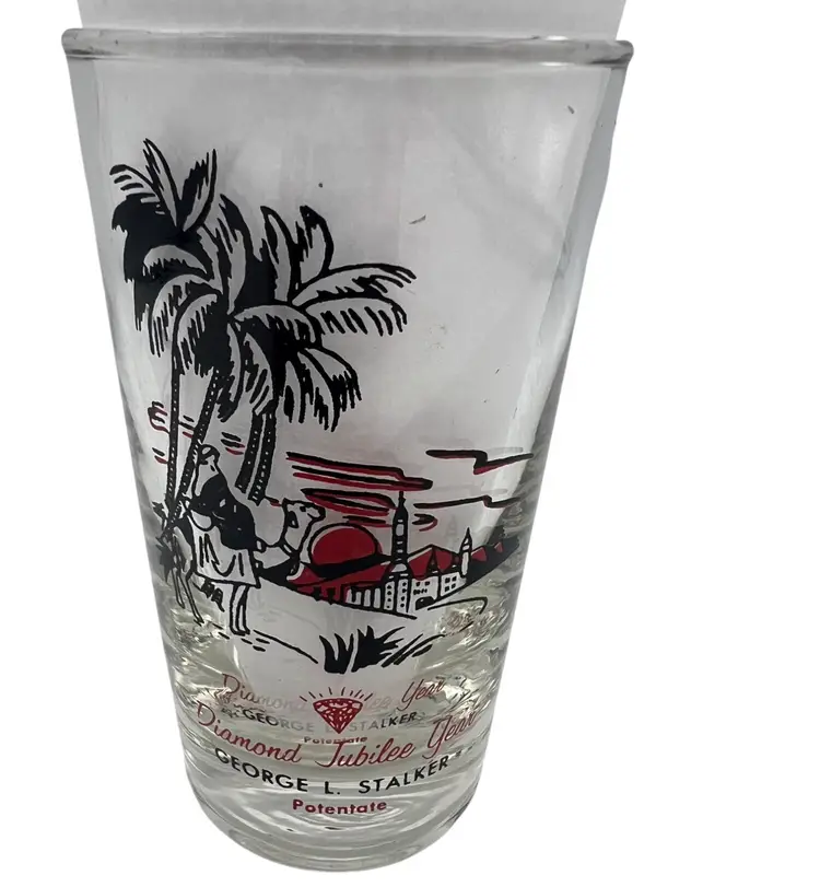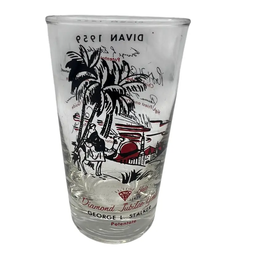 This collectible 1959 Shriner Divan commemorative glass features vibrant red and black detailing. Measuring approximately 4.5 inches tall, it includes the names and titles of the Divan members, along with a Diamond Jubilee Year theme and illustrations of a Middle Eastern desert scene with palm trees, a camel, and an architectural backdrop. The glass showcases historical significance with George L. Stalker listed as Potentate. Made of glass with printed designs, this piece is a cherished piece of vintage memorabilia.