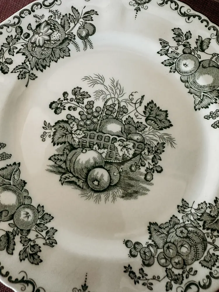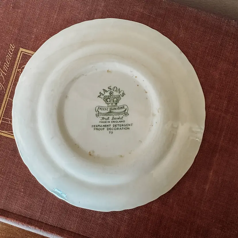 The "Fruit Basket" pattern is a classic design by Mason's Ironstone, featuring a detailed depiction of a fruit basket and floral motifs.