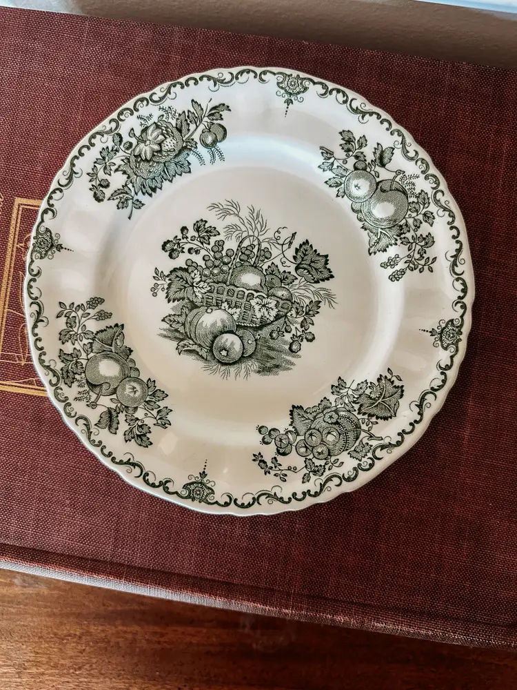 Beautiful Mason's Side Plate in the "Fruit Basket" pattern, featuring a green transferware print on a white/ cream background.