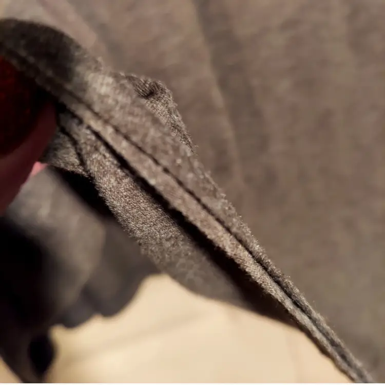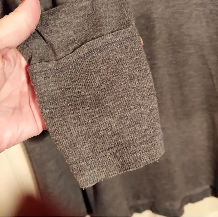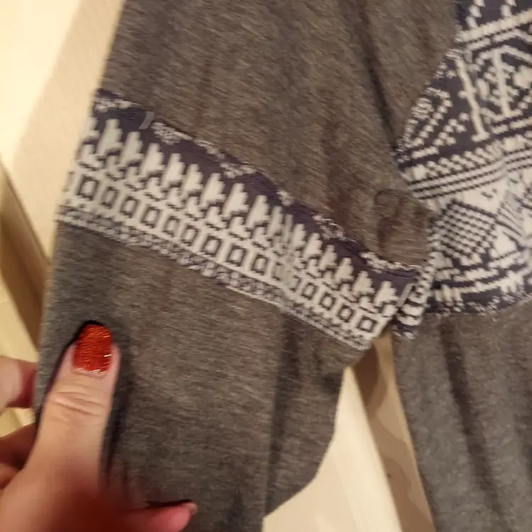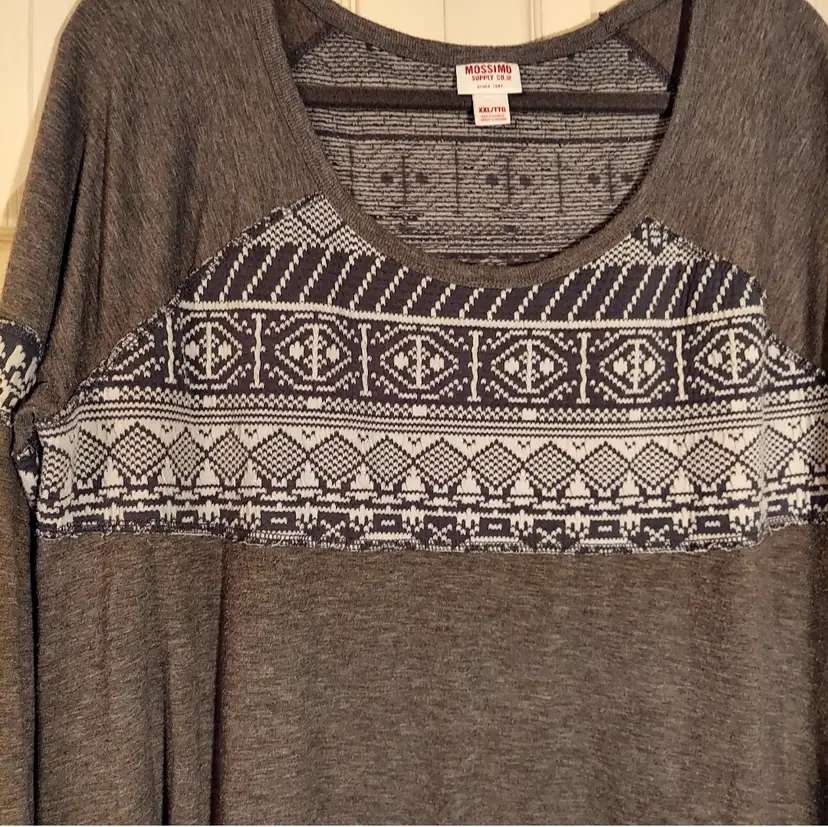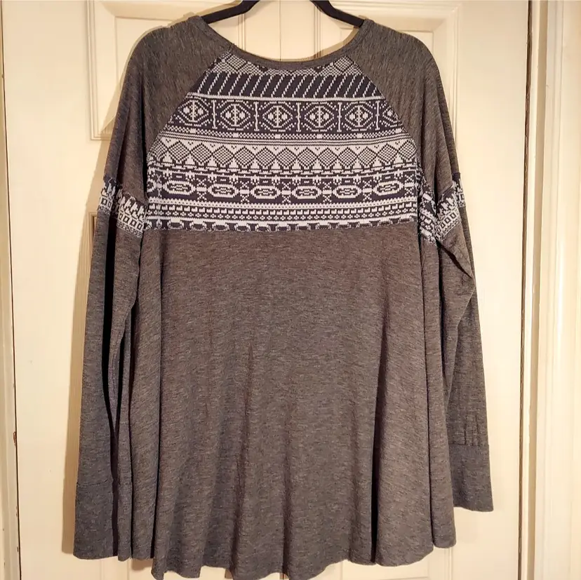 Dark heathered gray long sleeves, pattern on front and back. Raw edge at bottom. Smoke free home Measures 31" long, measures 22" across under the arms No rips or stains