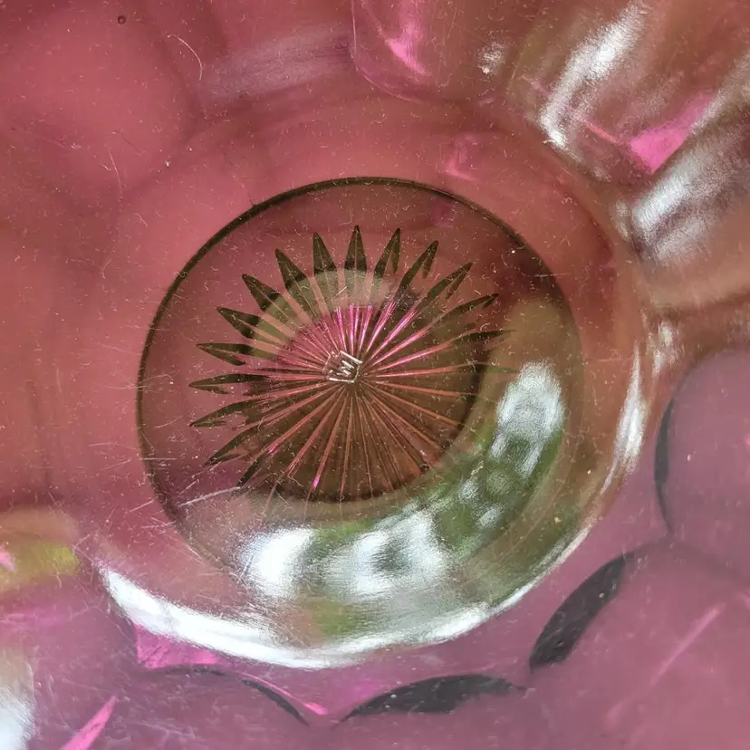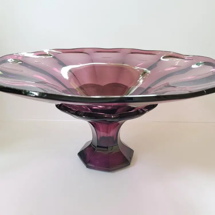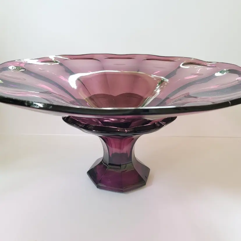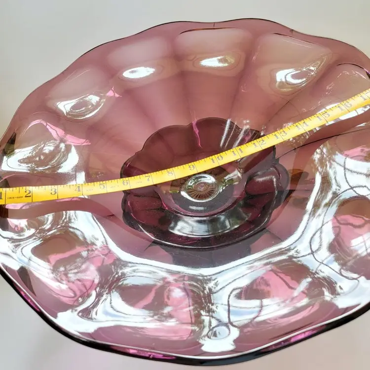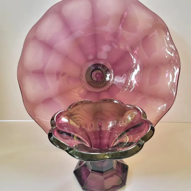 This is a RARE and extremely difficult item to find! This antique (1910-1929) Westmoreland amethyst glass console is MASSIVE! A huge 18" diameter This a 2 piece set Total height = 9" NOTE there are 2 stress marks as pictured (most likely from manufacturing). This is a TRUE statement piece!