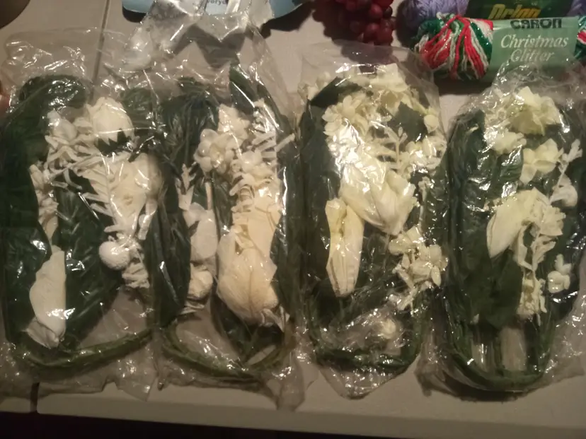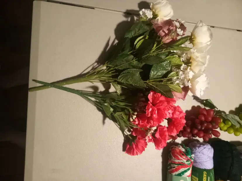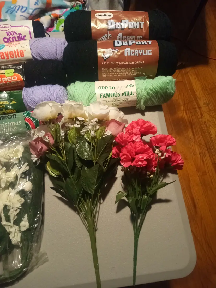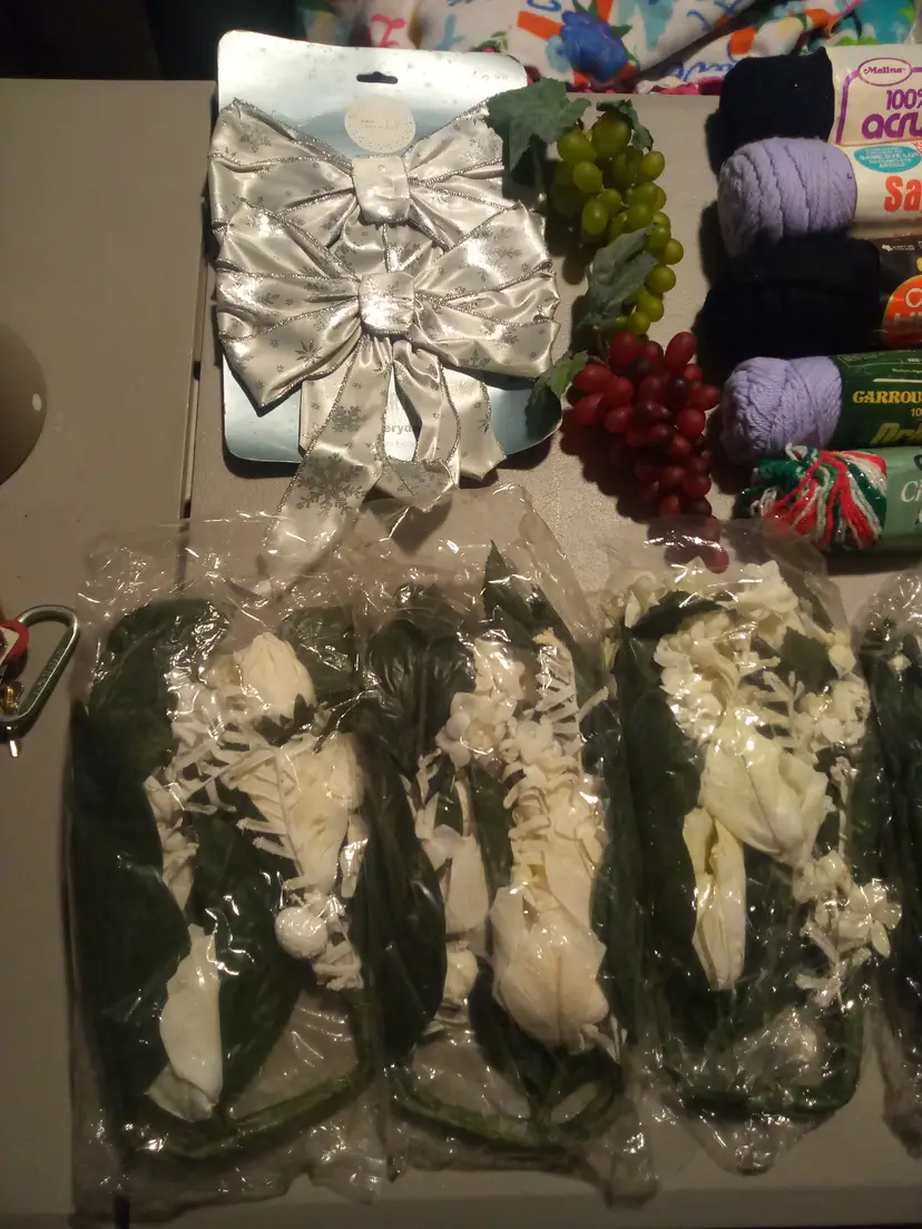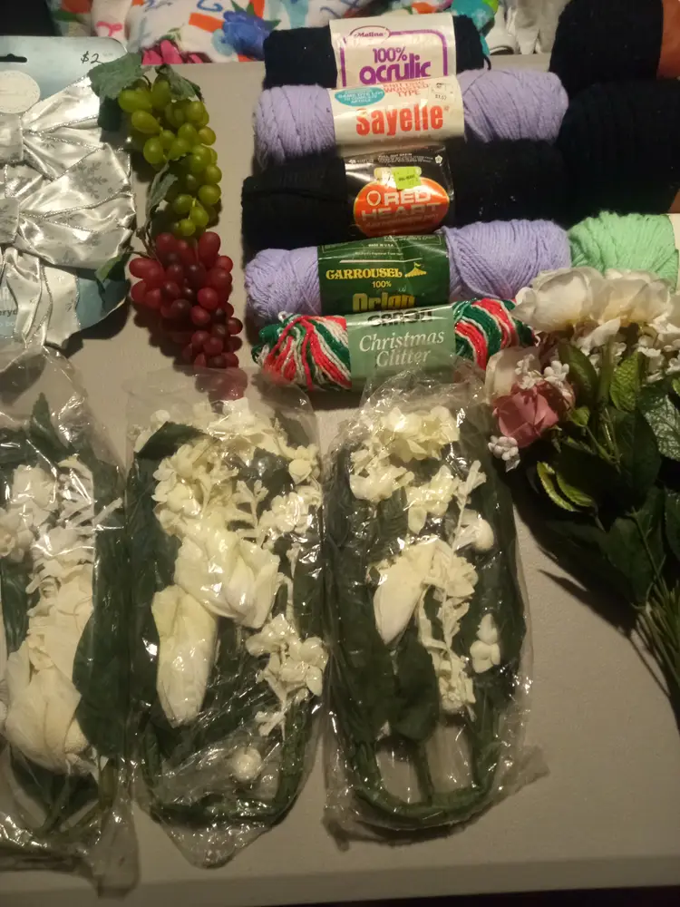 Large lot of Art Supplies. There are 15 items. (List of items) -6 things of Flowers -1 bow set -2 rubber Grape -8 things of Yarn