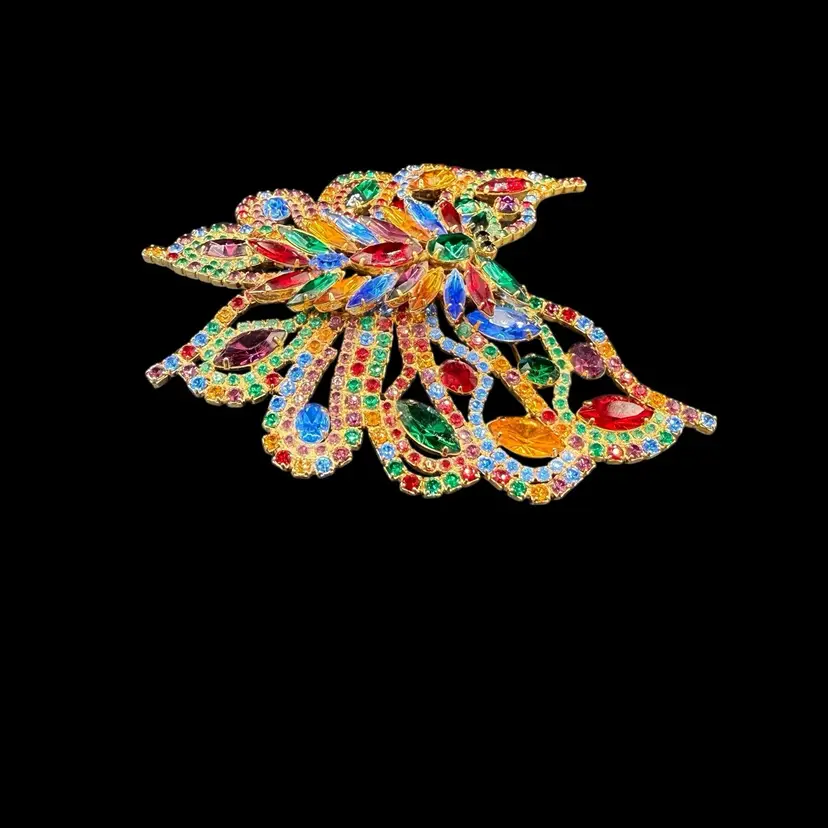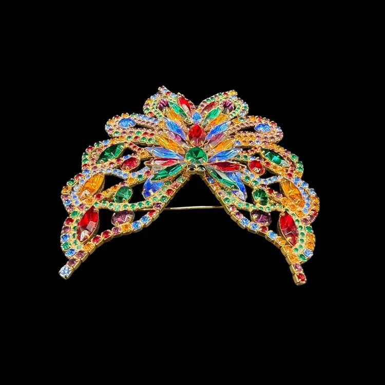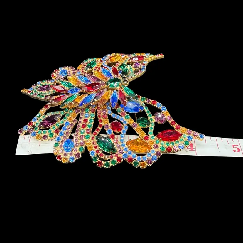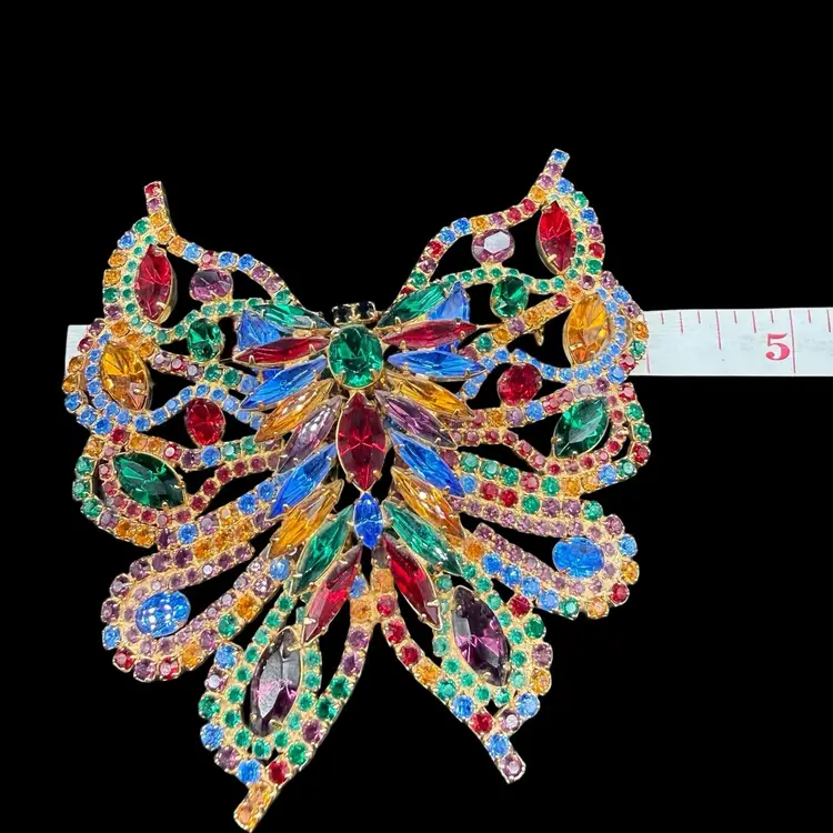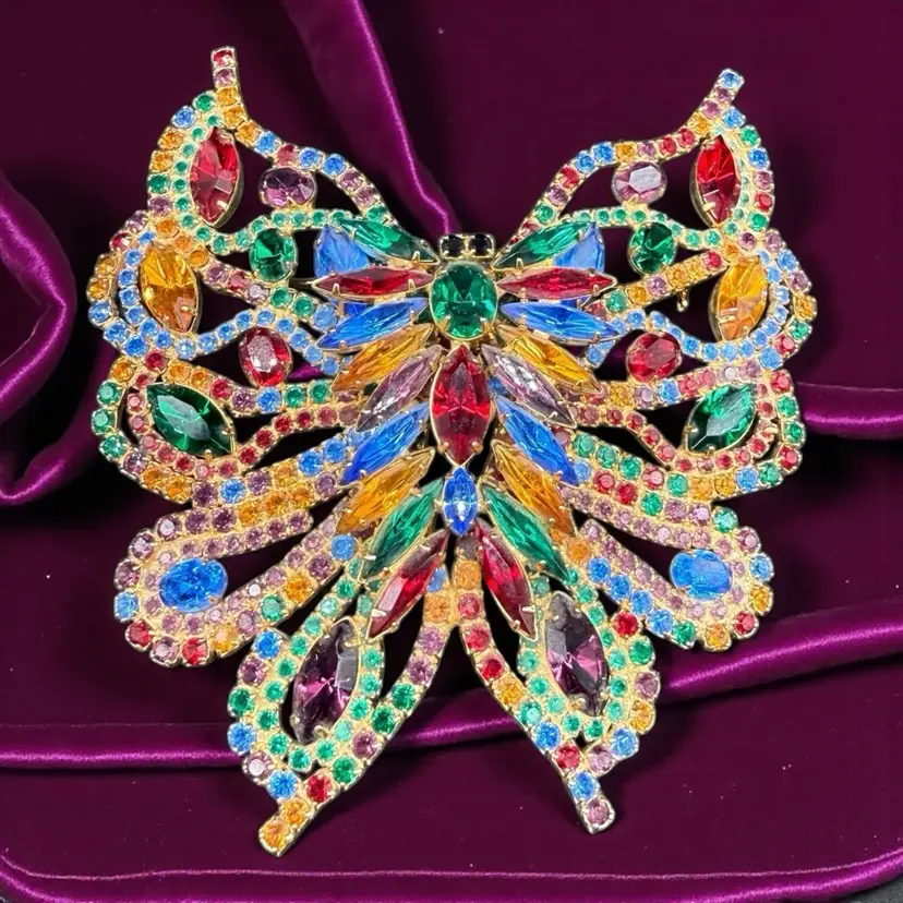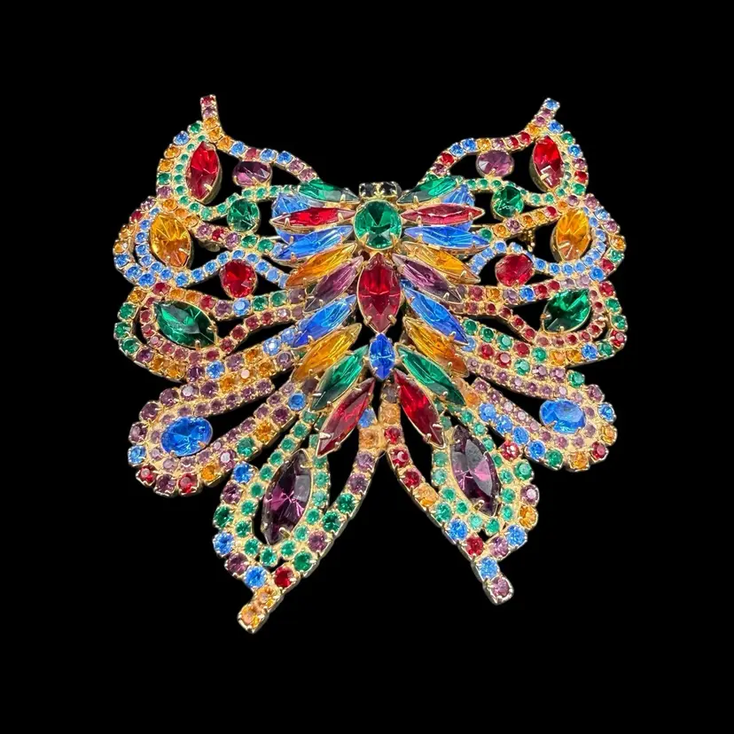 This vintage Dominique butterfly brooch pin is a stunning statement piece featuring a fruit salad of multicolor crystals in a butterfly shape. The brooch is unsigned and has a prong setting style, measuring 4.25 inches tall. Made with crystal rhinestones, this beauty is a unique and eye-catching accessory for both men and women. The chaton, teardrop, and navette stone shapes add a touch of elegance to this retro piece of vintage jewelry.
