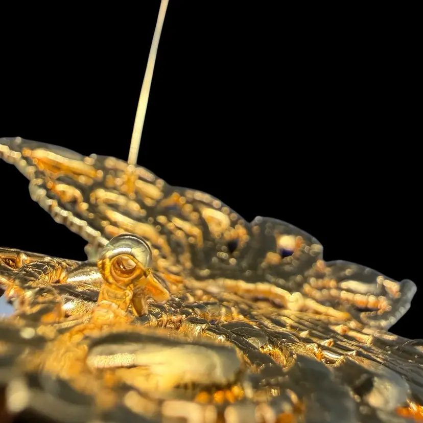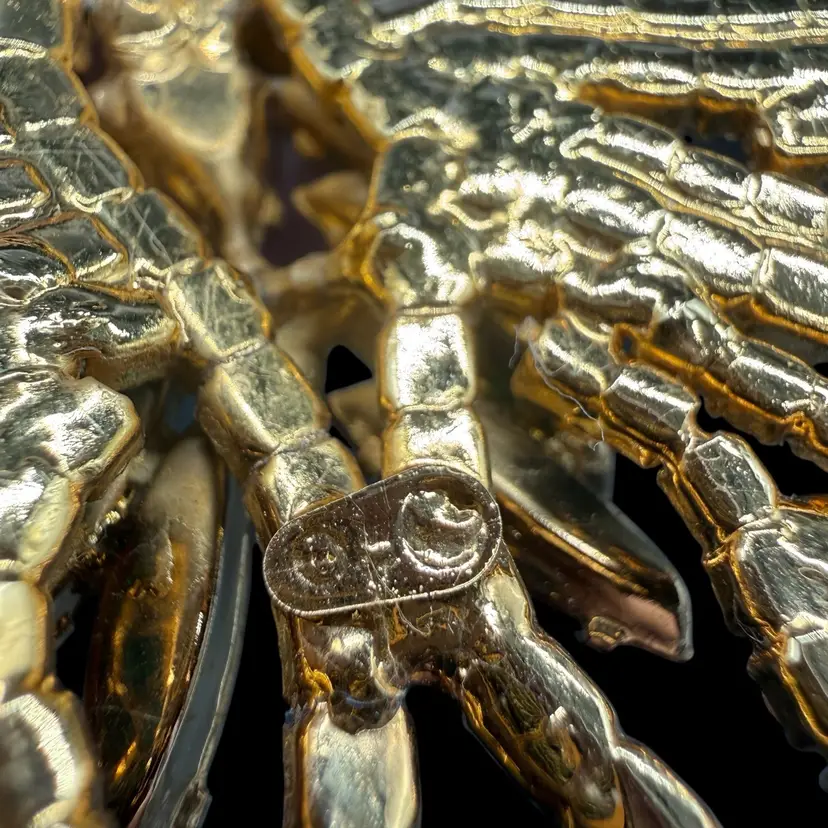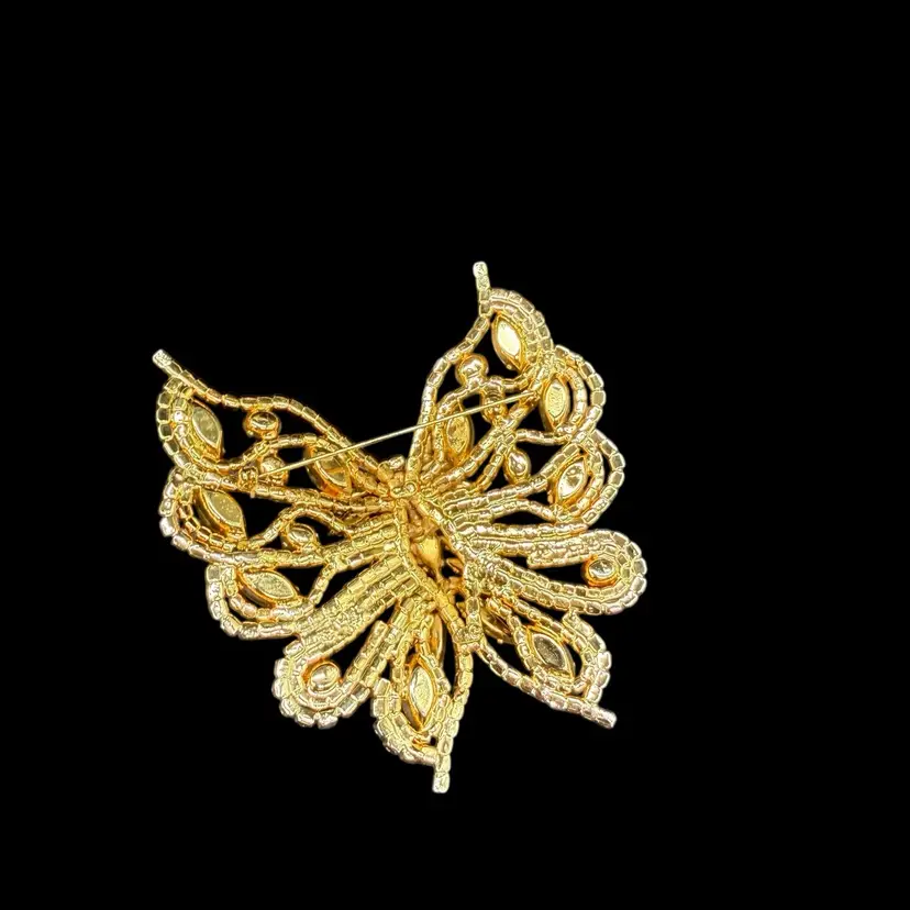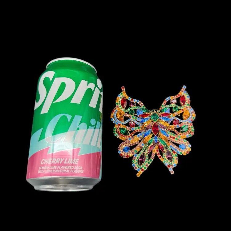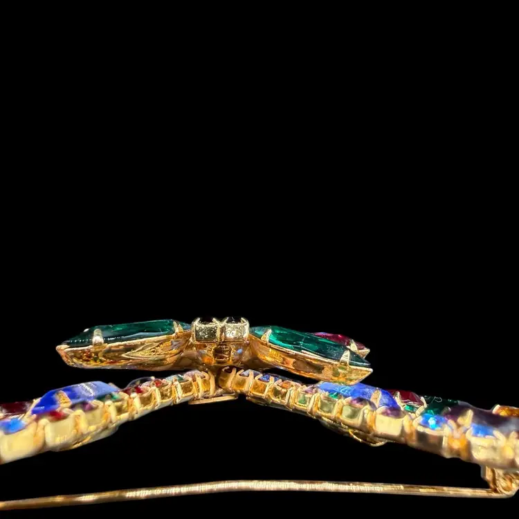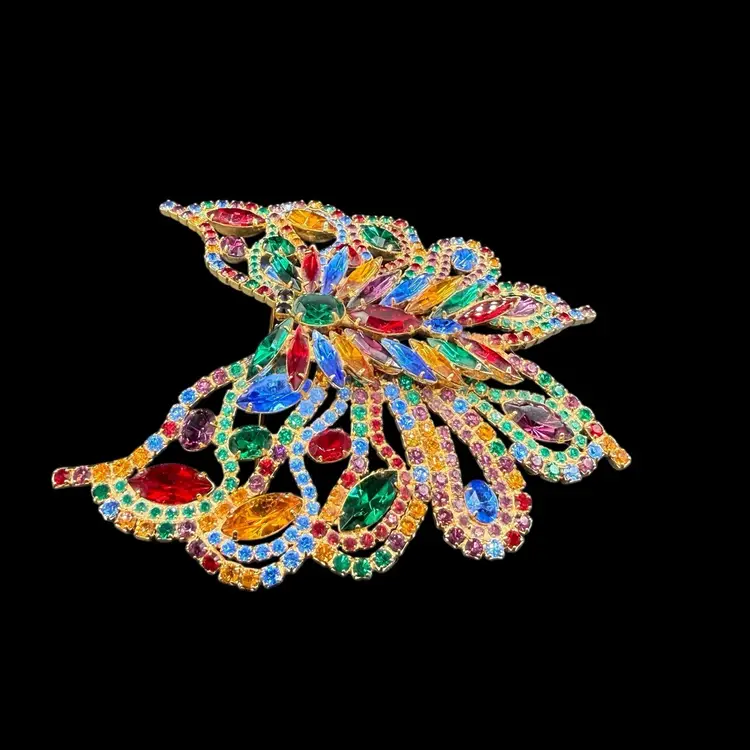 This vintage Dominique butterfly brooch pin is a stunning statement piece featuring a fruit salad of multicolor crystals in a butterfly shape. The brooch is unsigned and has a prong setting style, measuring 4.25 inches tall. Made with crystal rhinestones, this beauty is a unique and eye-catching accessory for both men and women. The chaton, teardrop, and navette stone shapes add a touch of elegance to this retro piece of vintage jewelry.