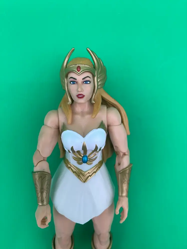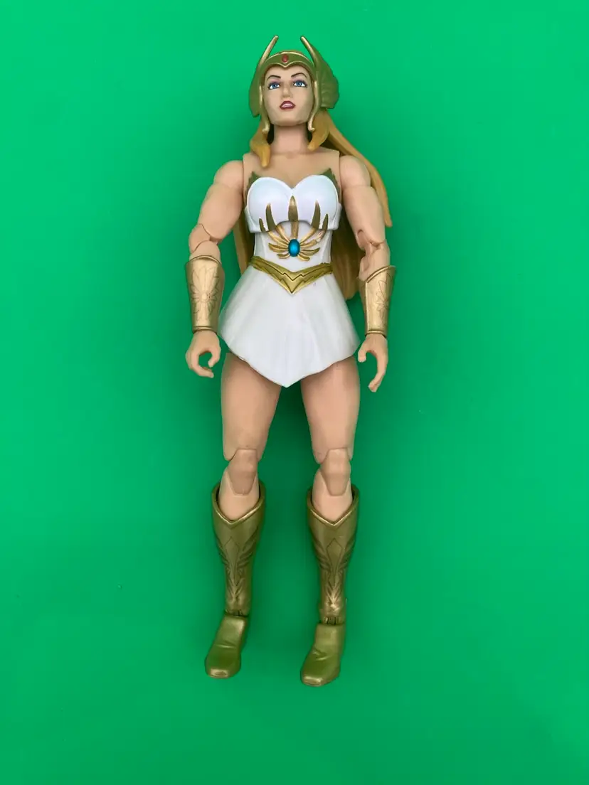 You are purchasing one Masters of the Universe Deluxe She-Ra Action Figure by Mattel from 2021. This Figure is in overall great condition. Minimal signs of wear. No chips, cracks, breaks or loose limbs.