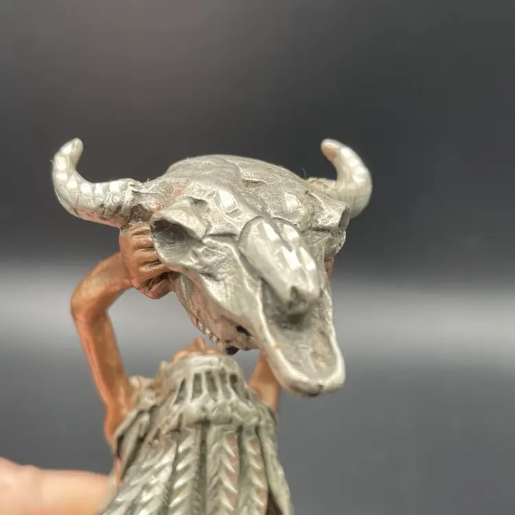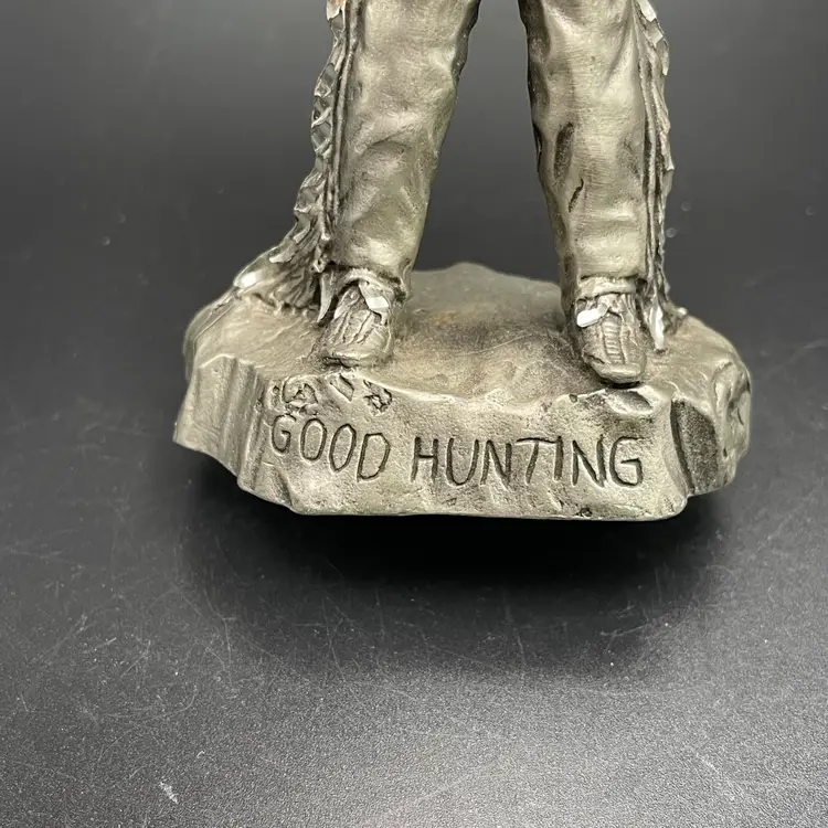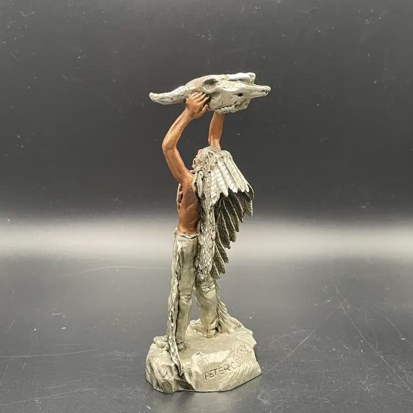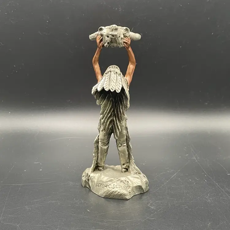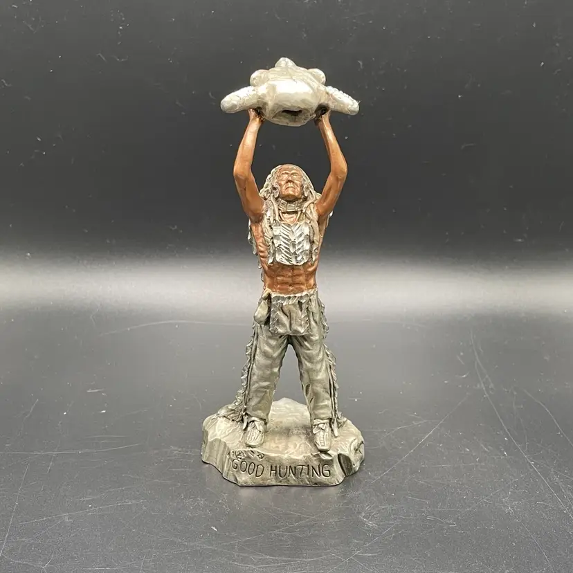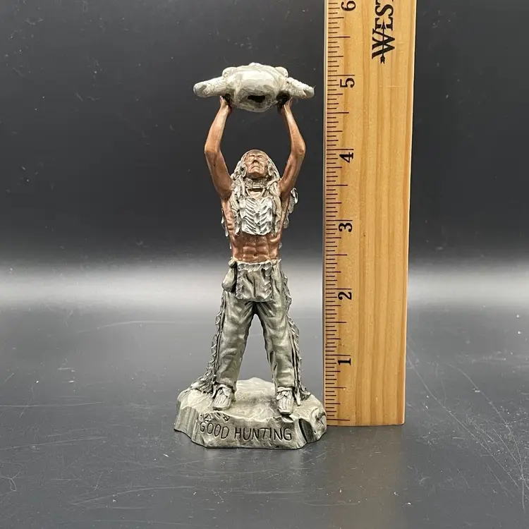 This is a vintage Masterworks Fine Pewter "Good Hunting" figurine featuring a Native American holding a buffalo skull. Designed by Peter C Sedlow. Measures 6" tall x 2.25" wide. No flaws.