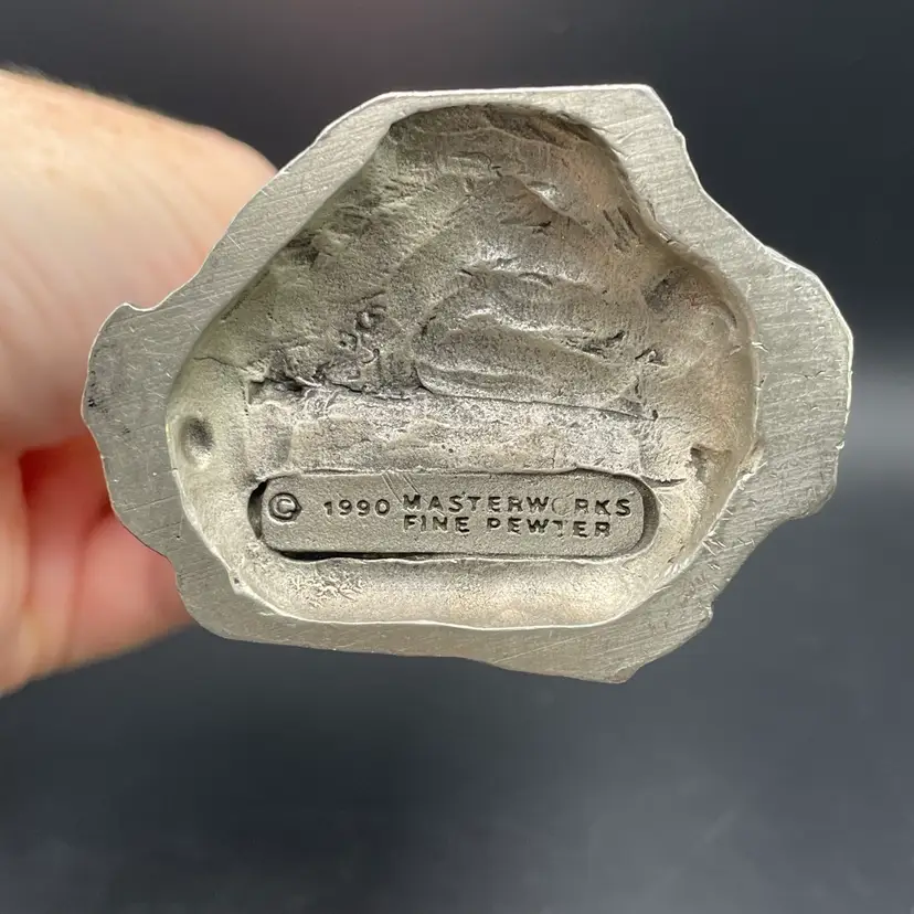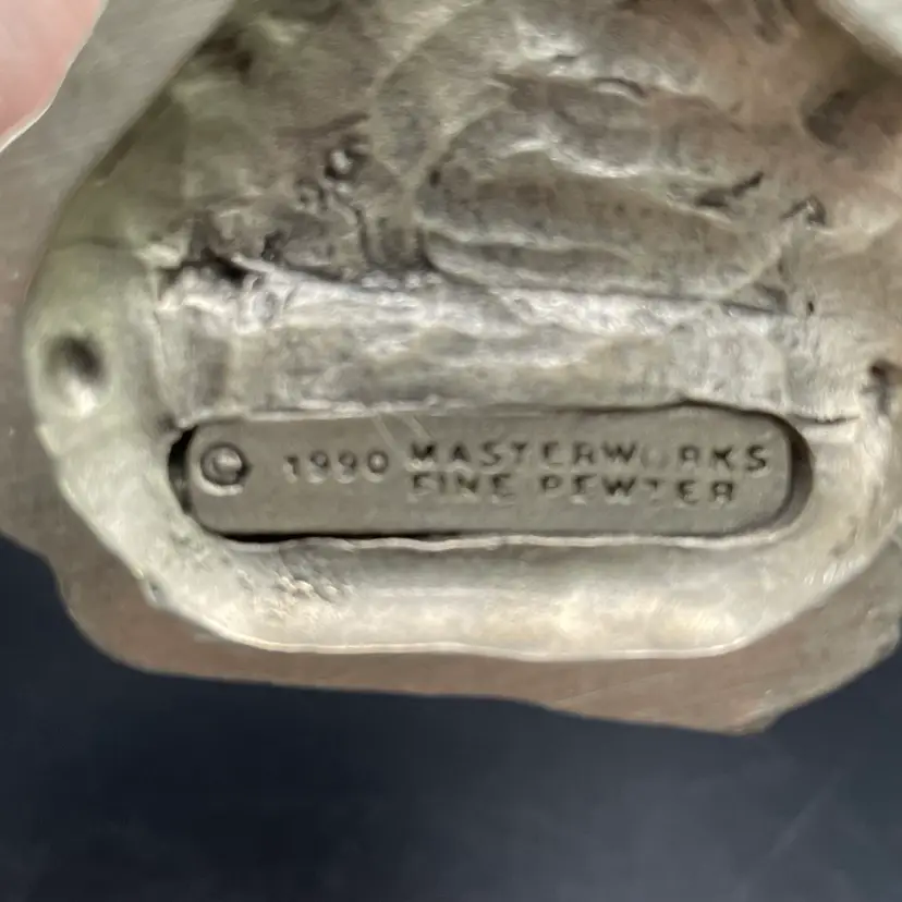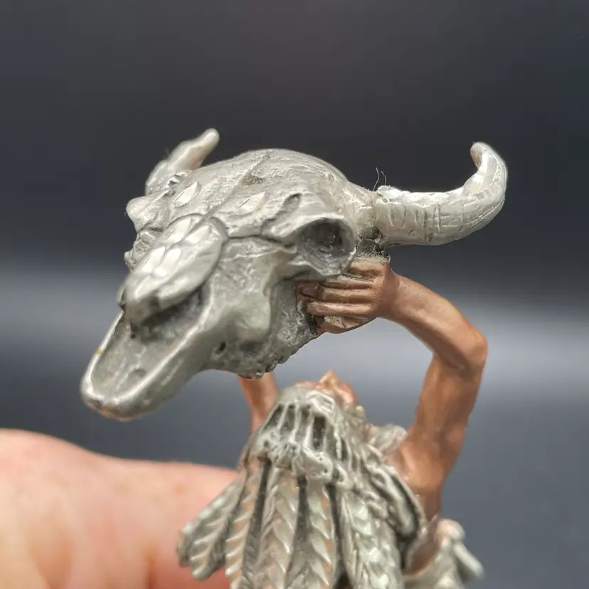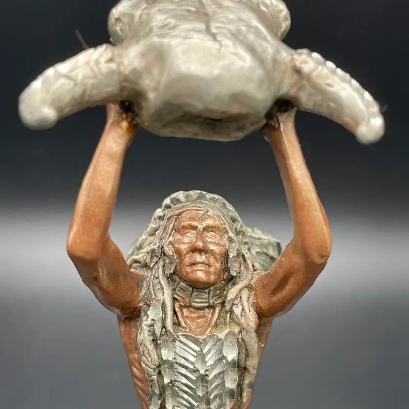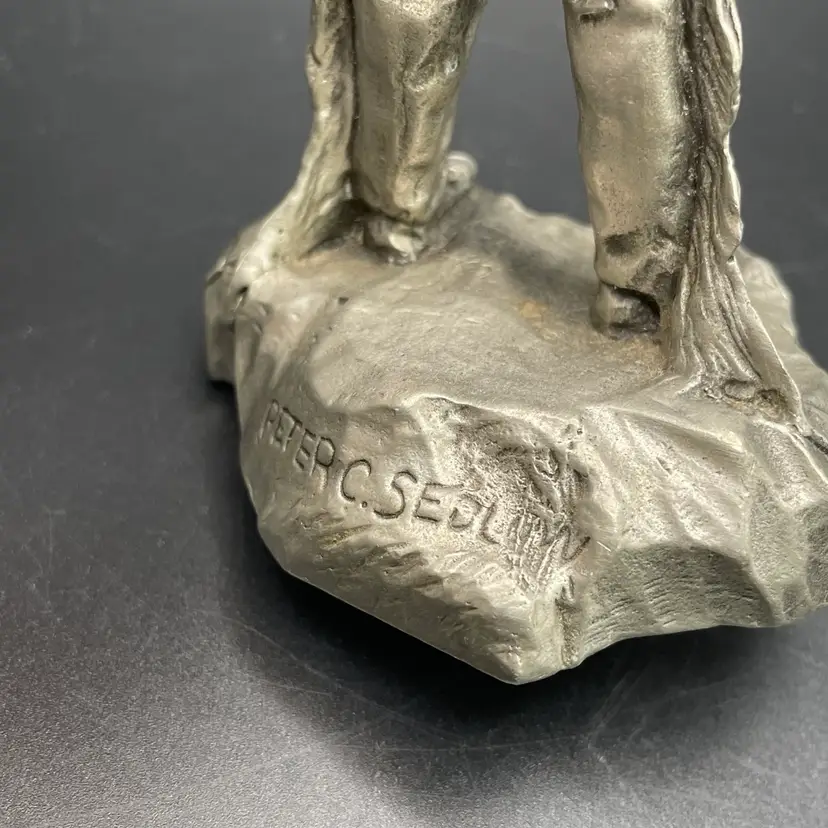 This is a vintage Masterworks Fine Pewter "Good Hunting" figurine featuring a Native American holding a buffalo skull. Designed by Peter C Sedlow. Measures 6" tall x 2.25" wide. No flaws.