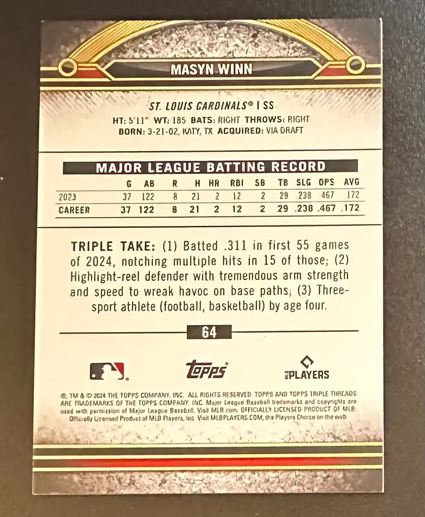 Check out this limited edition Masyn Winn rookie card, numbered 45 out of 50. A must-have for any Cardinals fan!