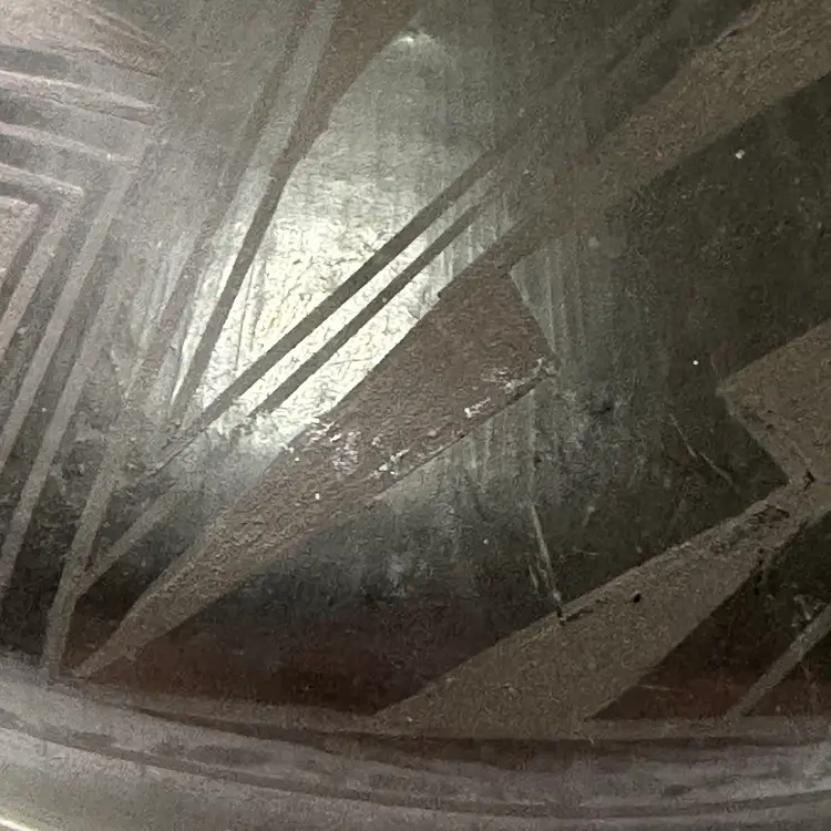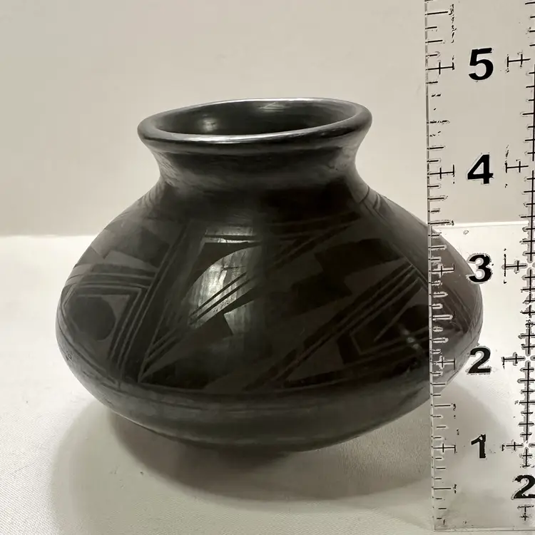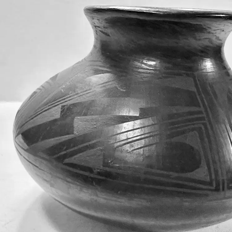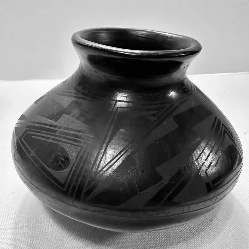 This listing is for this stunning piece of vintage Pueblo pottery crafted by hand in Mexico. The vase features a black-on-black design, common in Mata Ortiz pottery, which often employs geometric motifs and a round bottom. This technique involves a glossy black ground with matte black designs. Mata Ortiz pottery is a contemporary recreation of ancient Paquimé (Casas Grandes) ceramics and is known for its intricate designs and high quality.