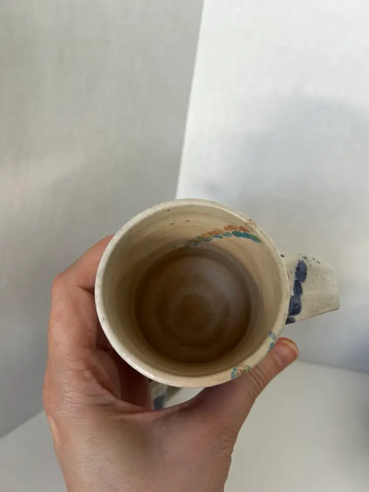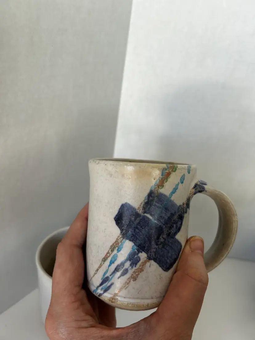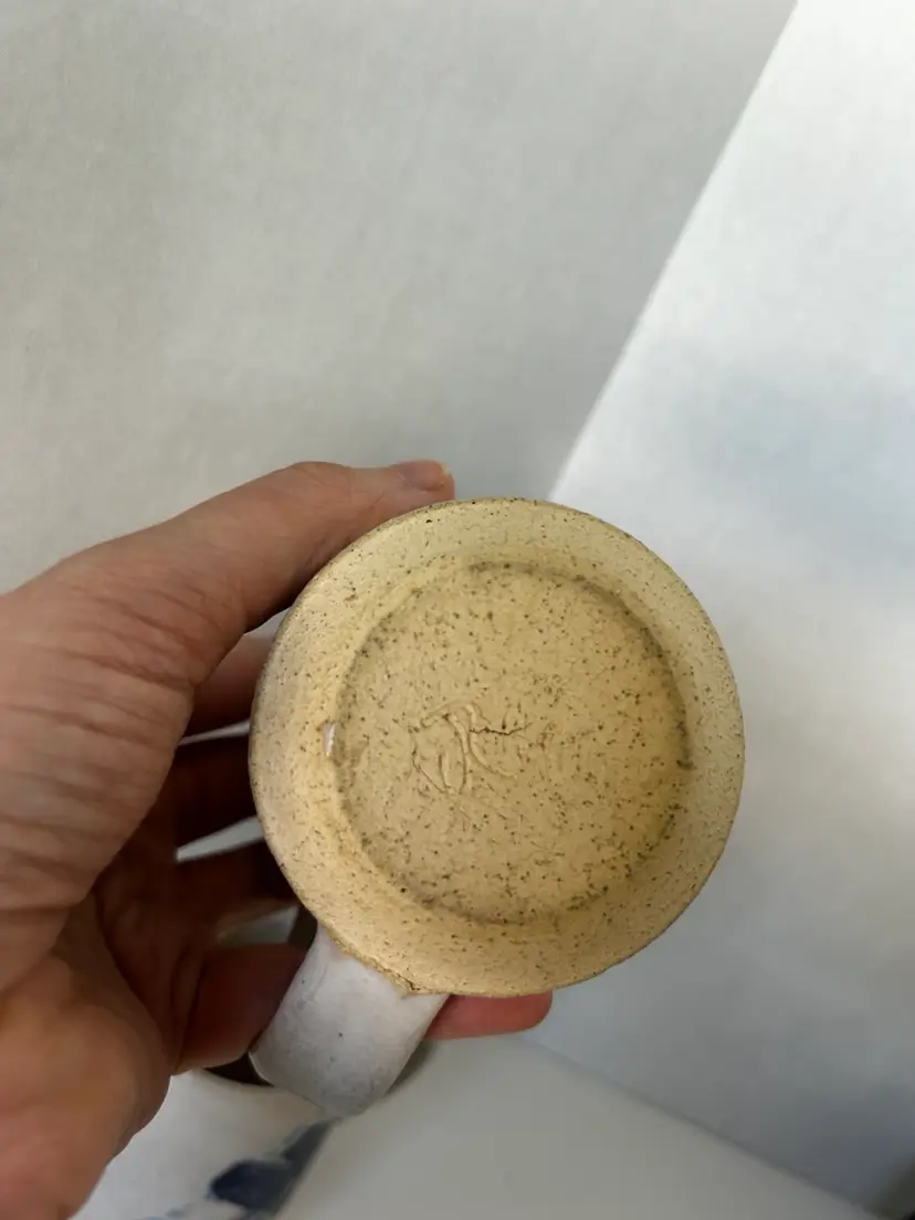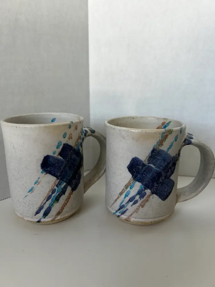 Signed. One mug is perfect. The other mug has tea stains and has a small flea bite on handle. No crazing