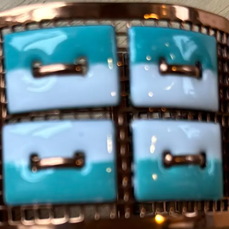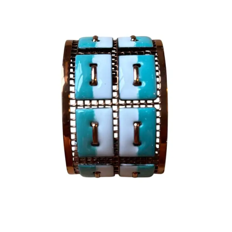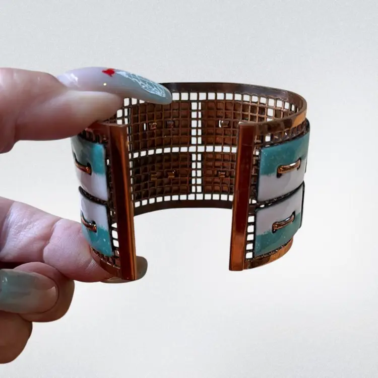 Here is a beautiful Matisse Mid-Century wide copper and enamel cuff bracelet dating to the 1950’s. It measures 1 ¾” wide with a 1 ¼” gap and is signed Matisse. It is constructed with copper screening and overlaid with rectangular hand painted enamel plaques stitched to the screening with visible copper rivets. The colors are white and light turquoise green. It’s in very good vintage condition with no chips or cracks to the enamel only some very light surface scratches on the copper due to its age and gentle use being mentioned to be accurate. A wonderful book piece featured in Copper the Art Jewelry: A Different Luster this bracelet would make a great addition to any woman’s vintage bracelet collection.
