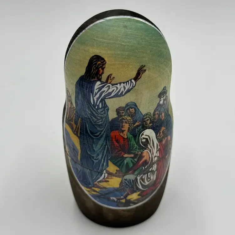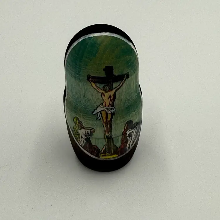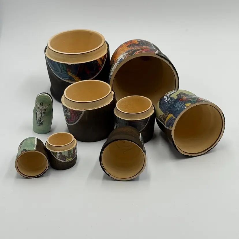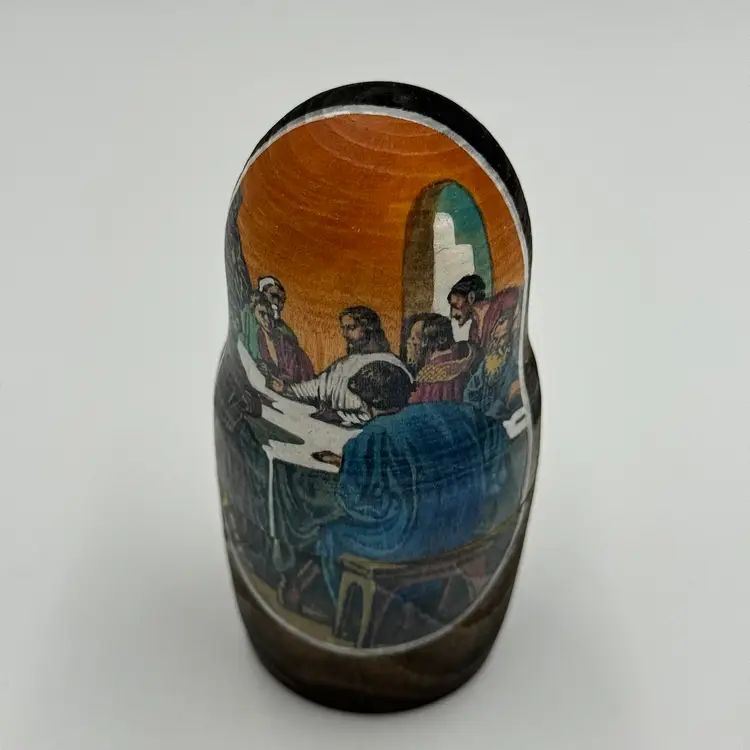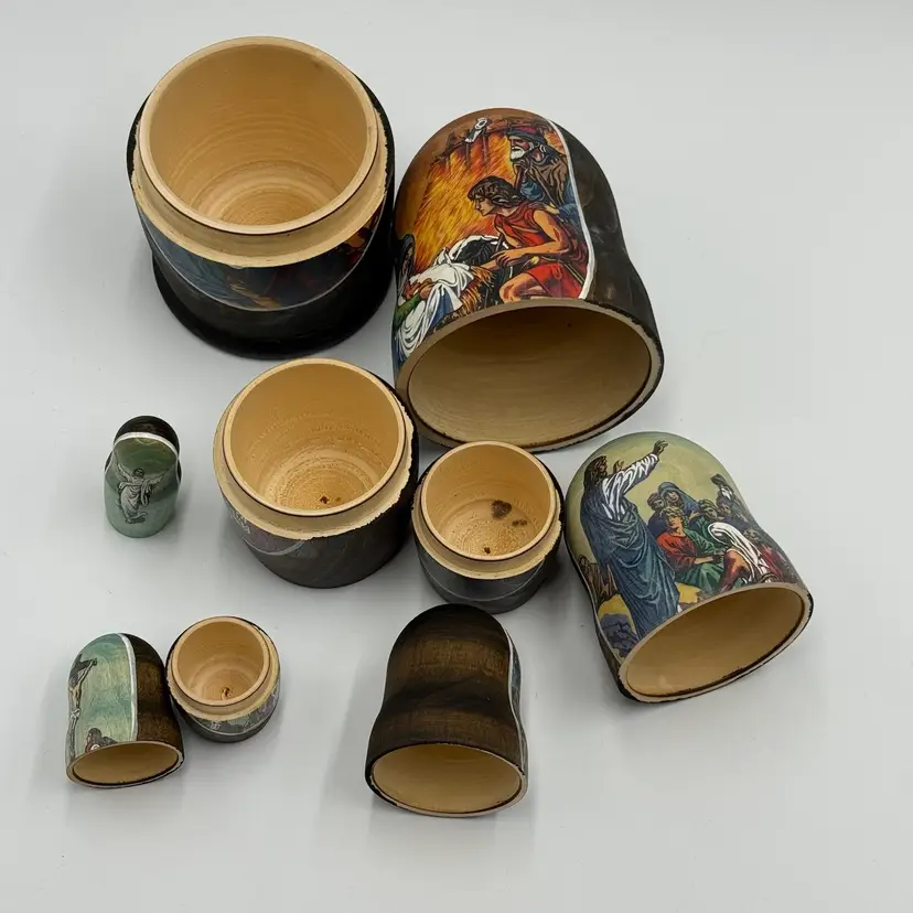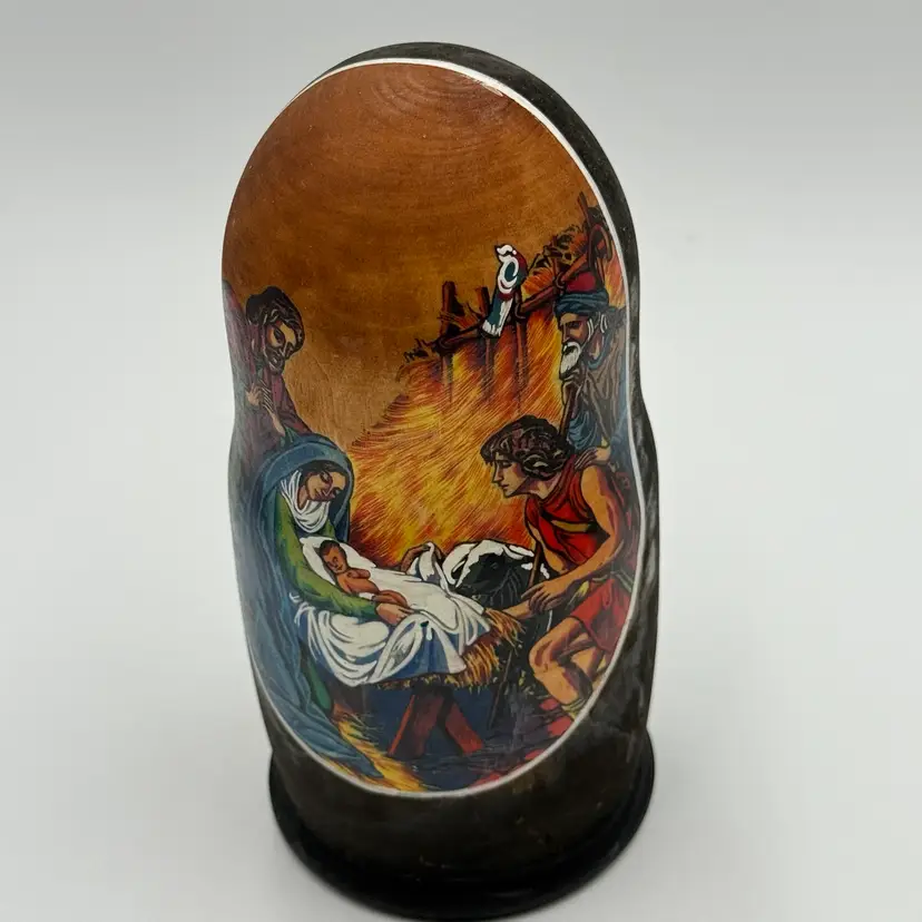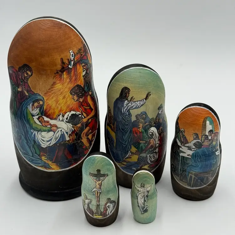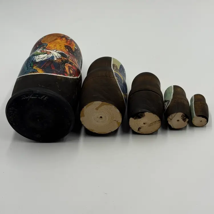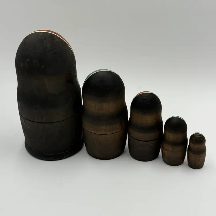 In good condition. Does not have any cracks or damage. There is some scuffing on the largest doll. The largest doll measures 7 inches tall and 3 1/2 inches in diameter at the base. The smallest doll measures 2 inches tall and 3/4 inches wide.