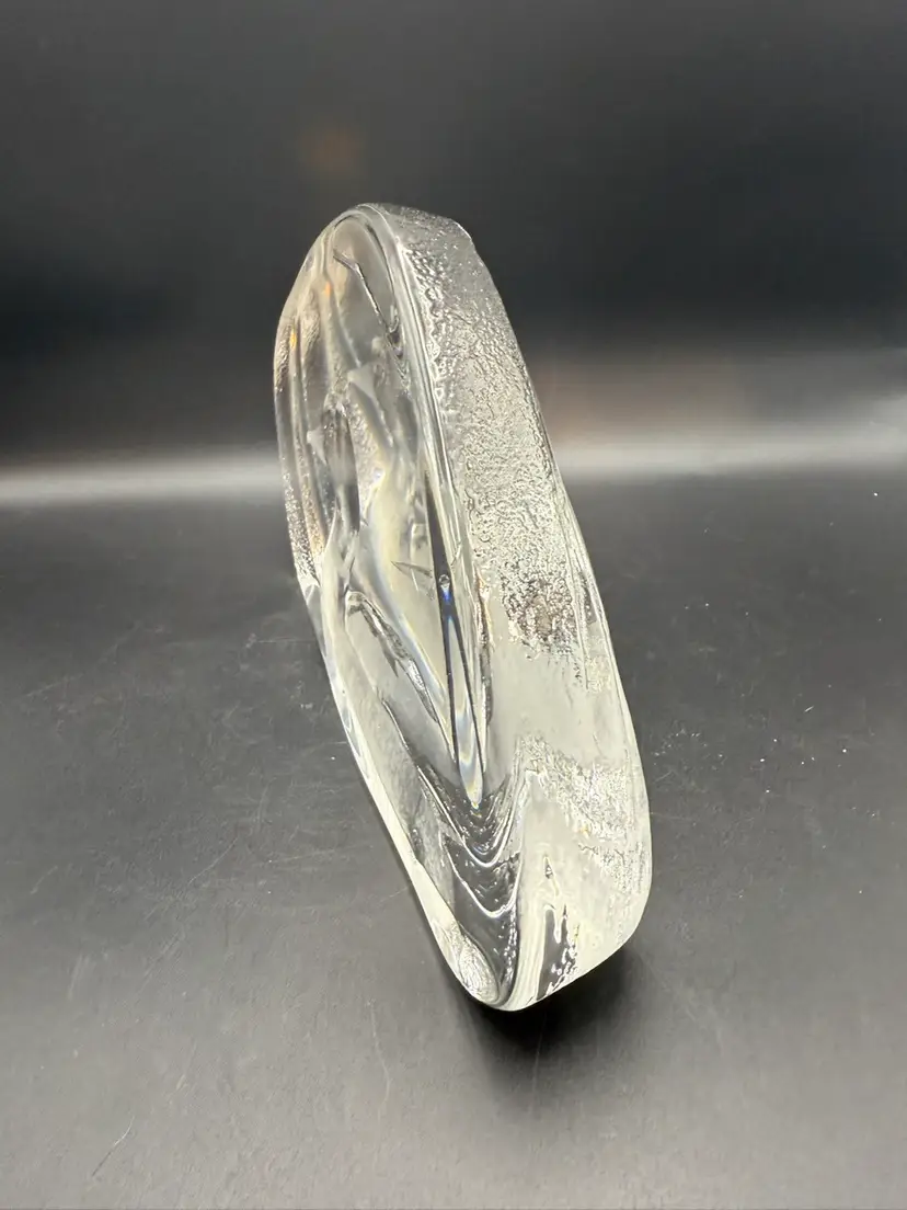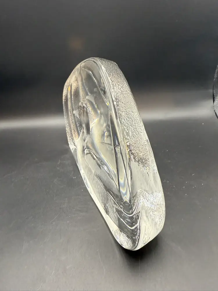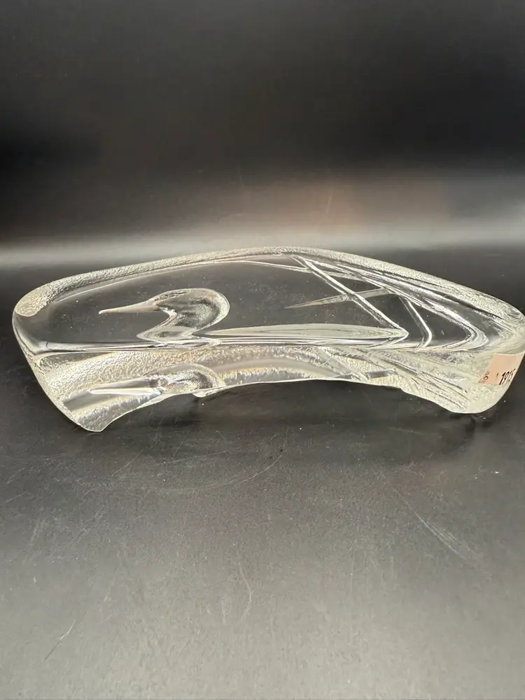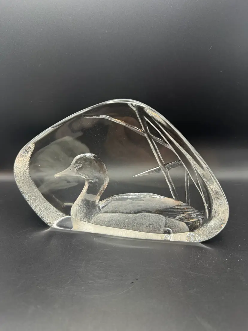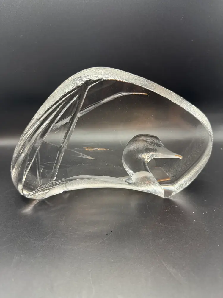 This particular piece, a duck sculpture within a glass enclosure, exemplifies Jonasson's signature style. The use of clear crystal, combined with intricate etching and texturing, brings the subject to life. Such pieces embody the blend of form and utility characteristic of Scandinavian design.