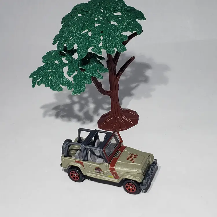 Mattel 2017 Matchbox Jurassic Park Jeep Wrangler and Tree MB1127 FMW93 Tree Measures: 3.5" x 3" x 4" Jeep Measures: 2.5" x 1.25" x 1.25" Pre-owned. See Photos.